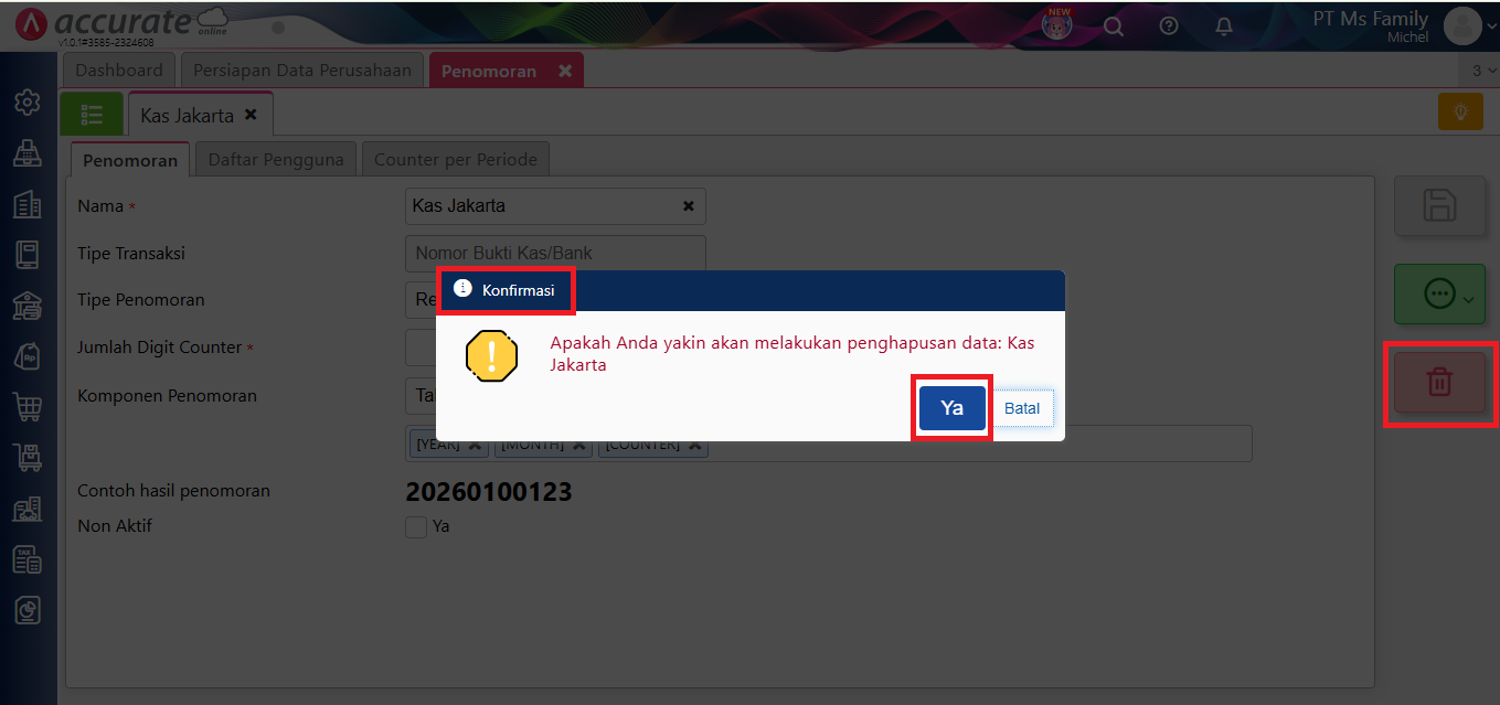- Kemudian hapus penomoran tersebut, maka tampil pesan konfirmasi, lalu klik Ya.