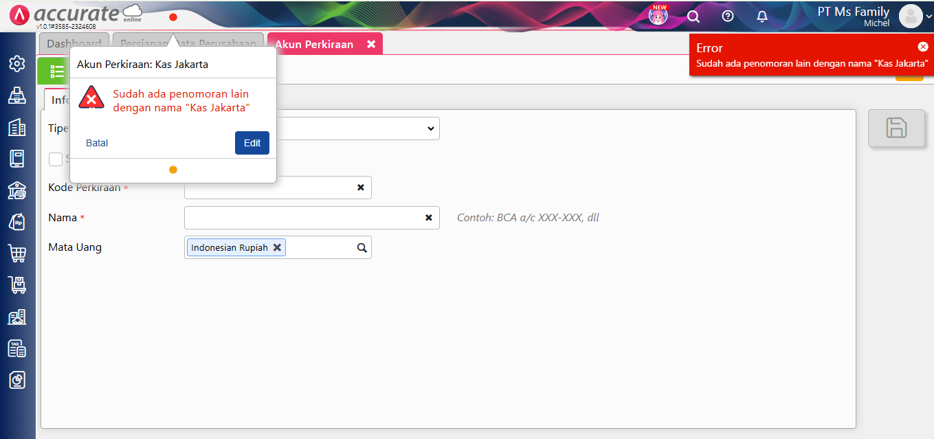 Pada saat Anda membuat akun perkiraan kemudian menghapusnya, lalu membuat lagi dengan nama yang sama, kemudian tampil error seperti gambar berikut: