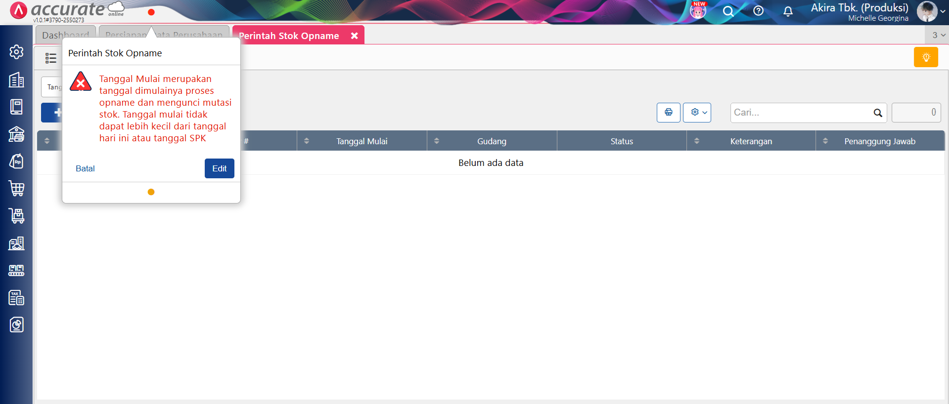 Pada Accurate Online, ketika simpan perintah stok opname dan tampil pesan error “Tanggal Mulai merupakan tanggal dimulainya proses opname dan mengunci mutasi stok …“, seperti gambar berikut ini: