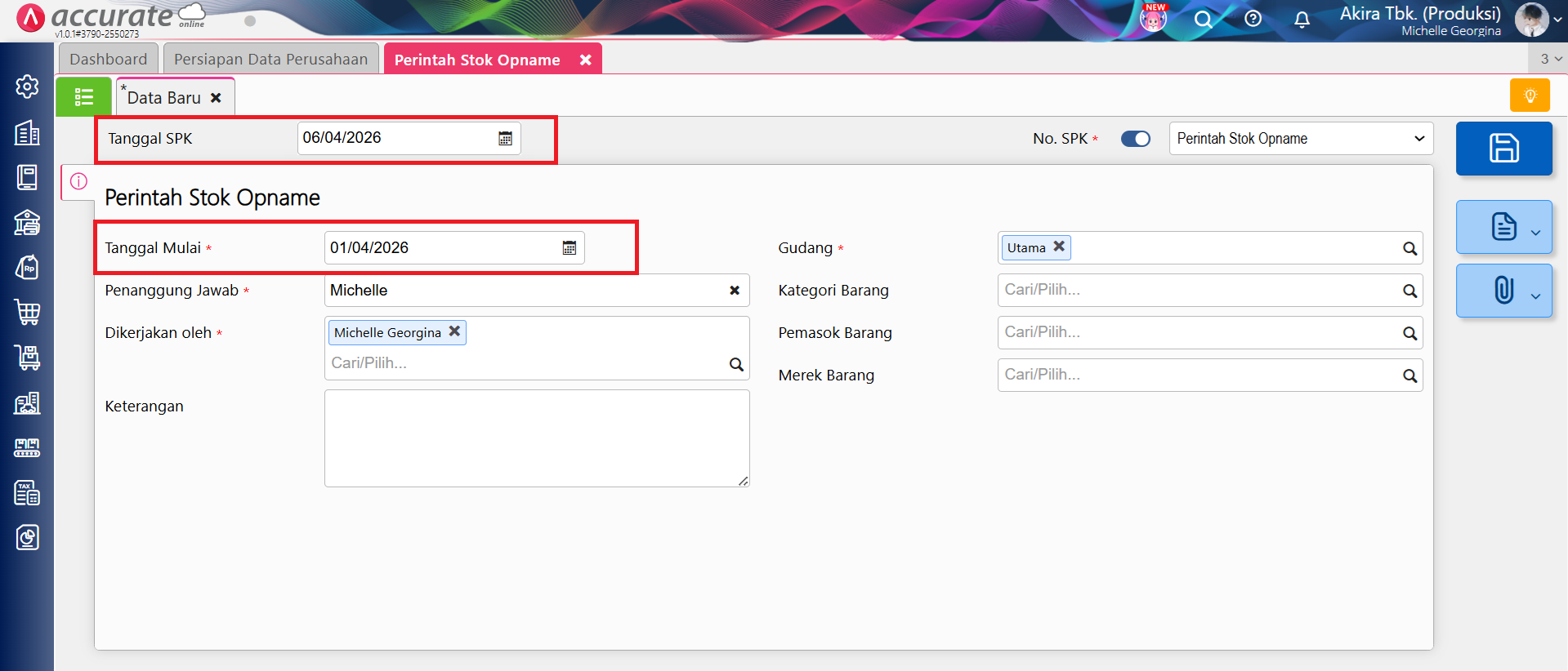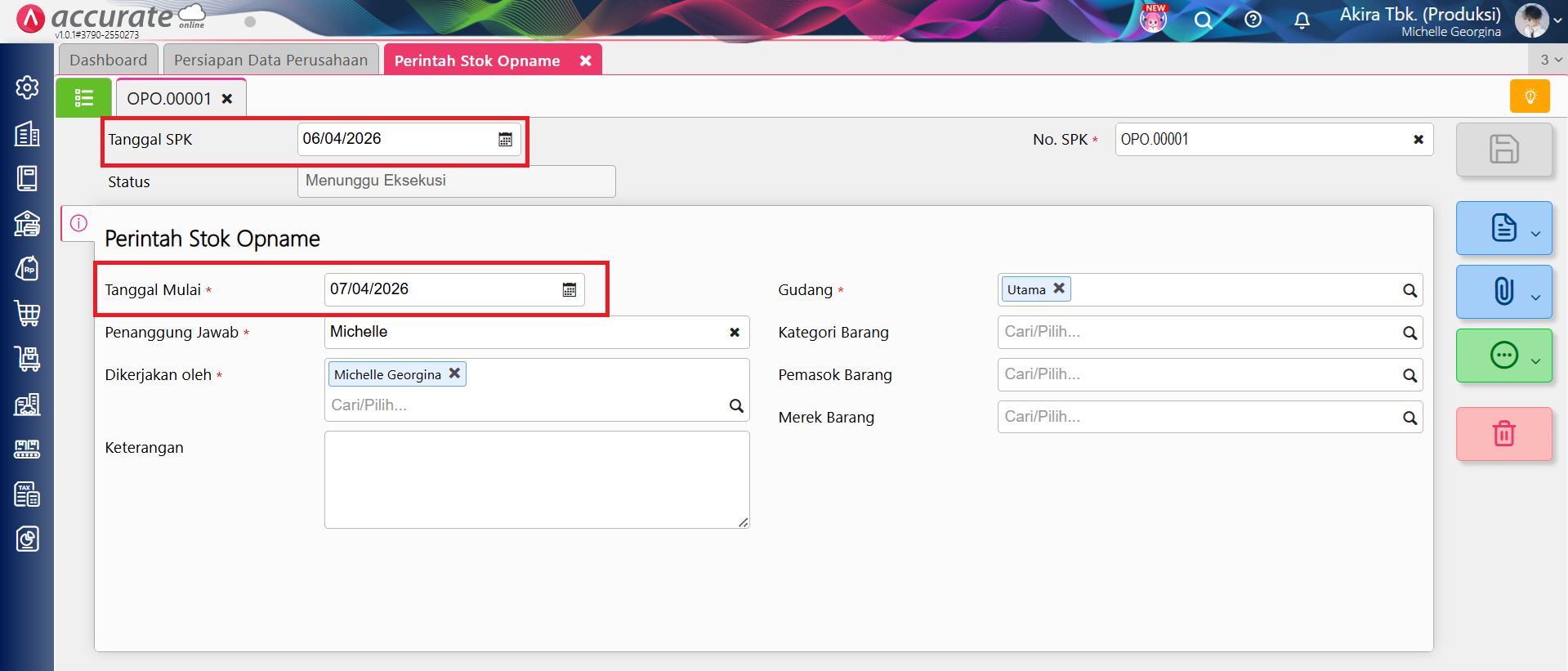 Sehingga untuk melakukan proses perintah stok opname, pastikan Tanggal Mulai yang diinputkan ini sama dengan Tanggal SPK, atau lebih besar dari tanggal tersebut.