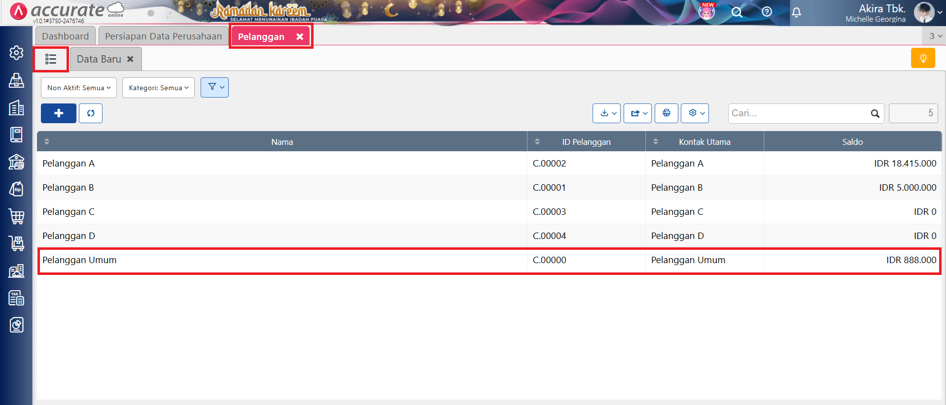 - Ke menu Penjualan | Pelanggan, lalu klik tombol Daftar berwarna hijau di samping tab Data Baru, dan pilih pelanggan yang dimaksud.