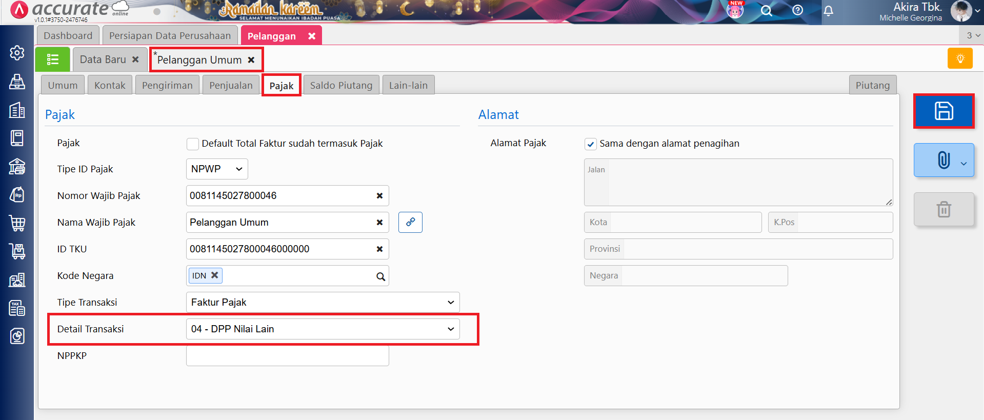 - Selanjutnya ke tab Pajak, dan pada bagian Detail Transaksi ubah ke ‘04 – DPP Nilai Lain’, lalu klik Simpan.