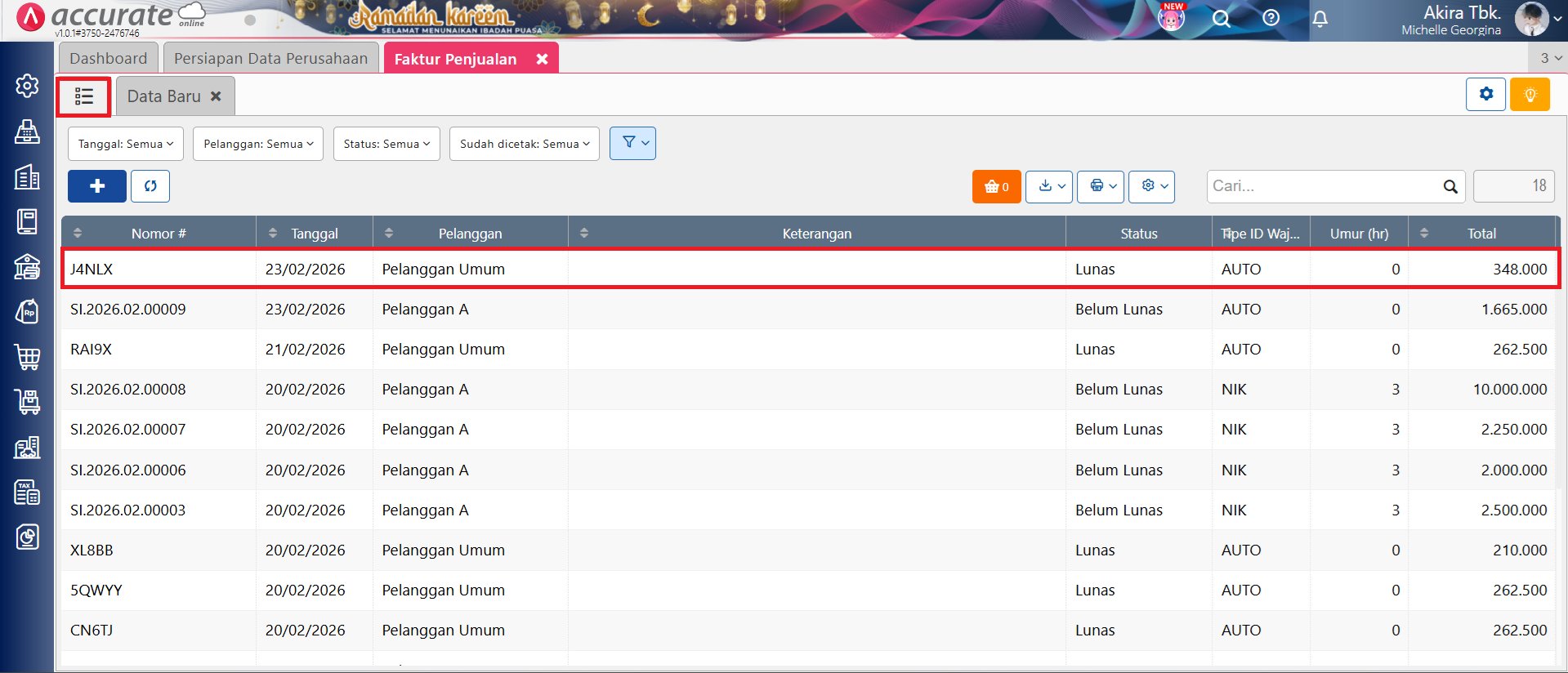 - Apabila transaksi faktur penjualan tersebut sudah berhasil diimpor ulang, maka untuk transaksi tersebut akan tampil pada halaman Daftar Faktur Penjualan.
