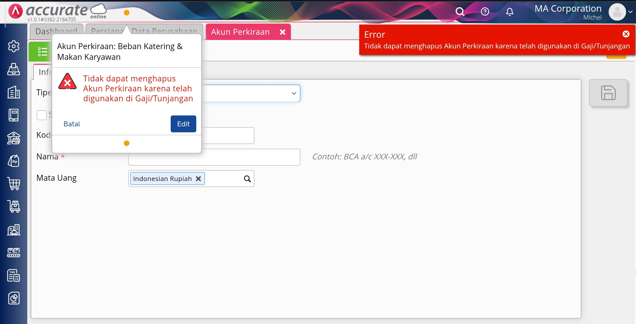 Pada saat hapus akun perkiraan, tampil pesan error seperti gambar di bawah ini.