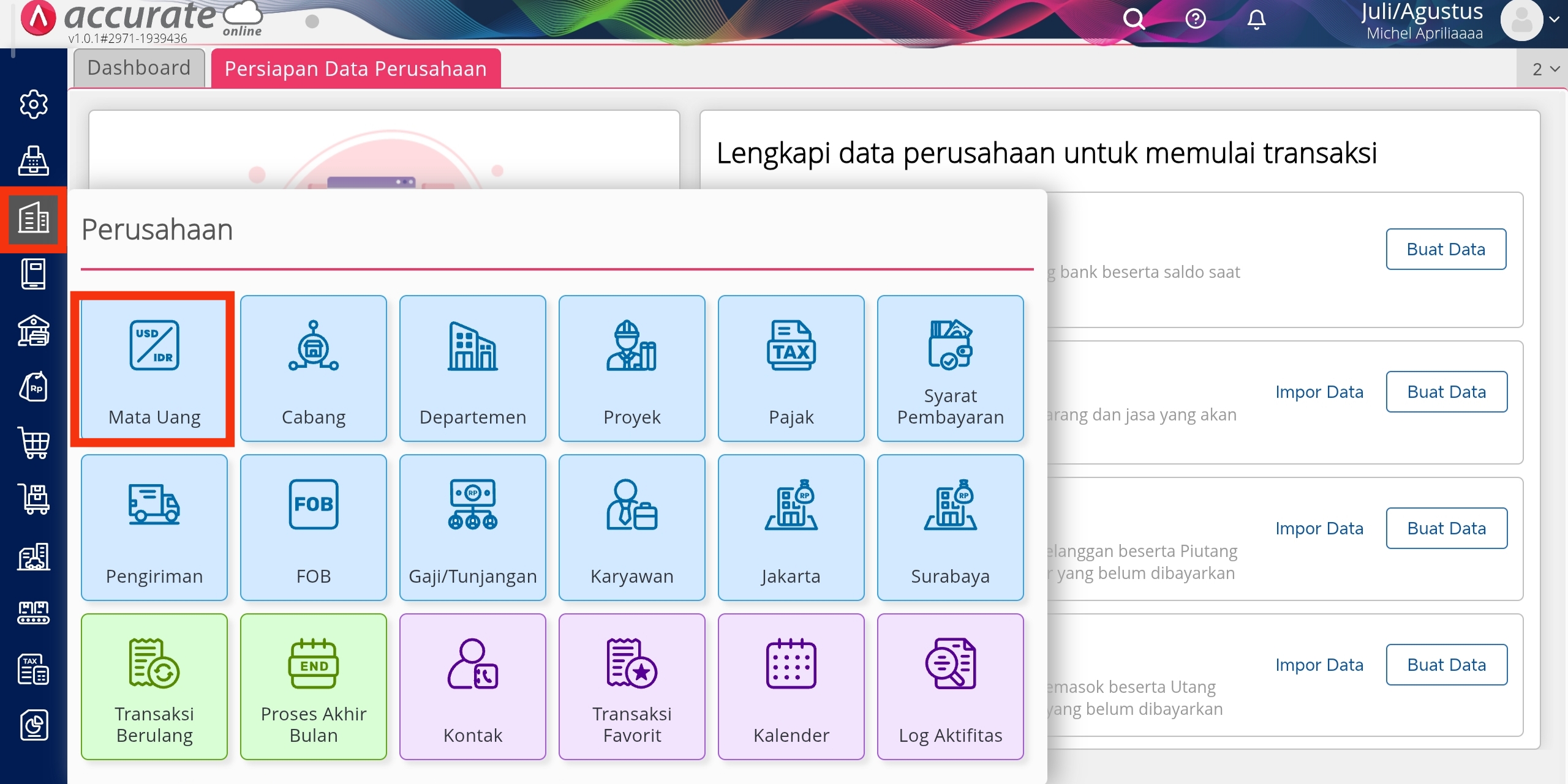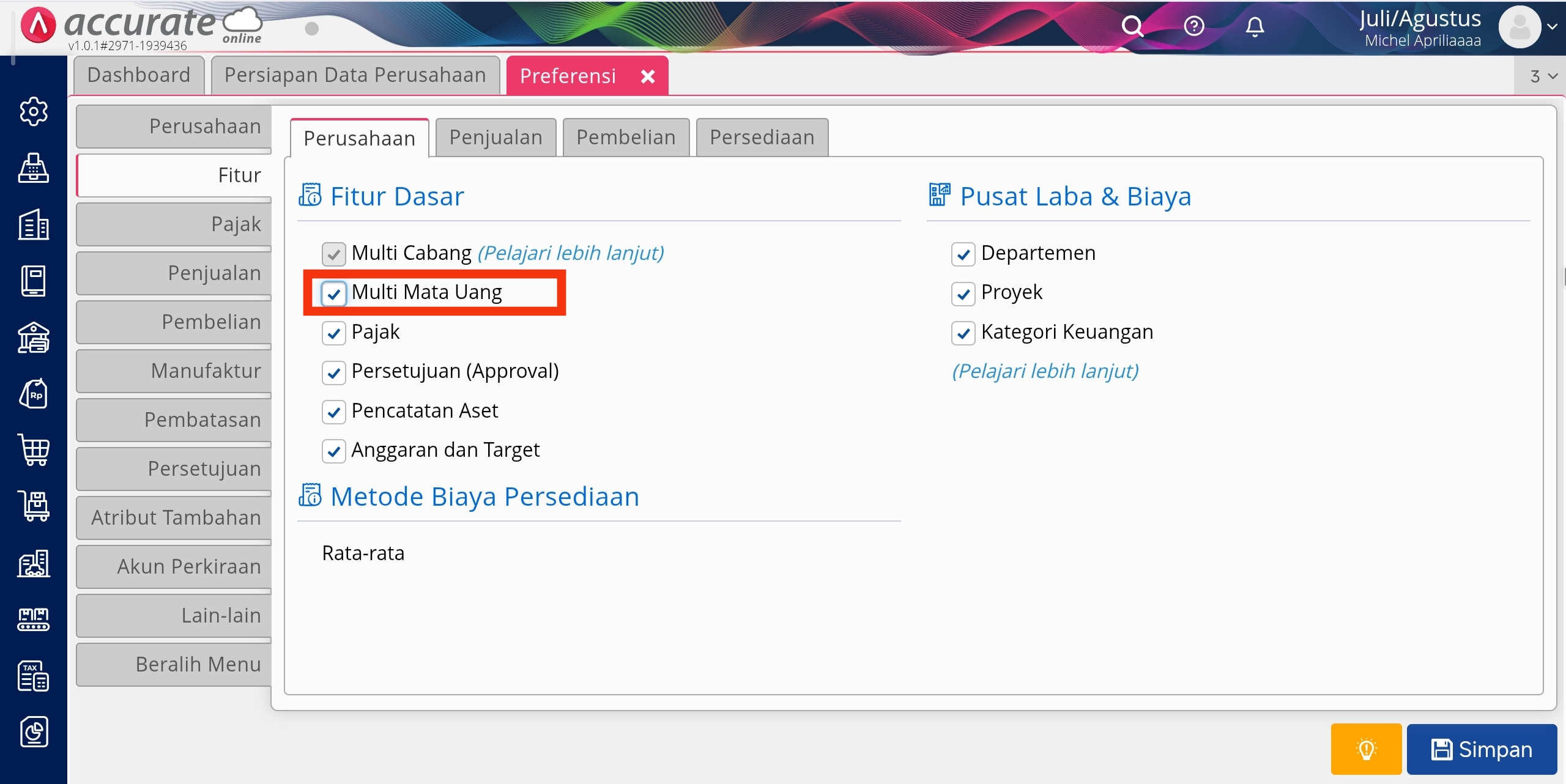 - Aktifkan fitur Multi Mata Uang dari menu Pengaturan | Preferensi | Fitur, centang Multi Mata Uang.