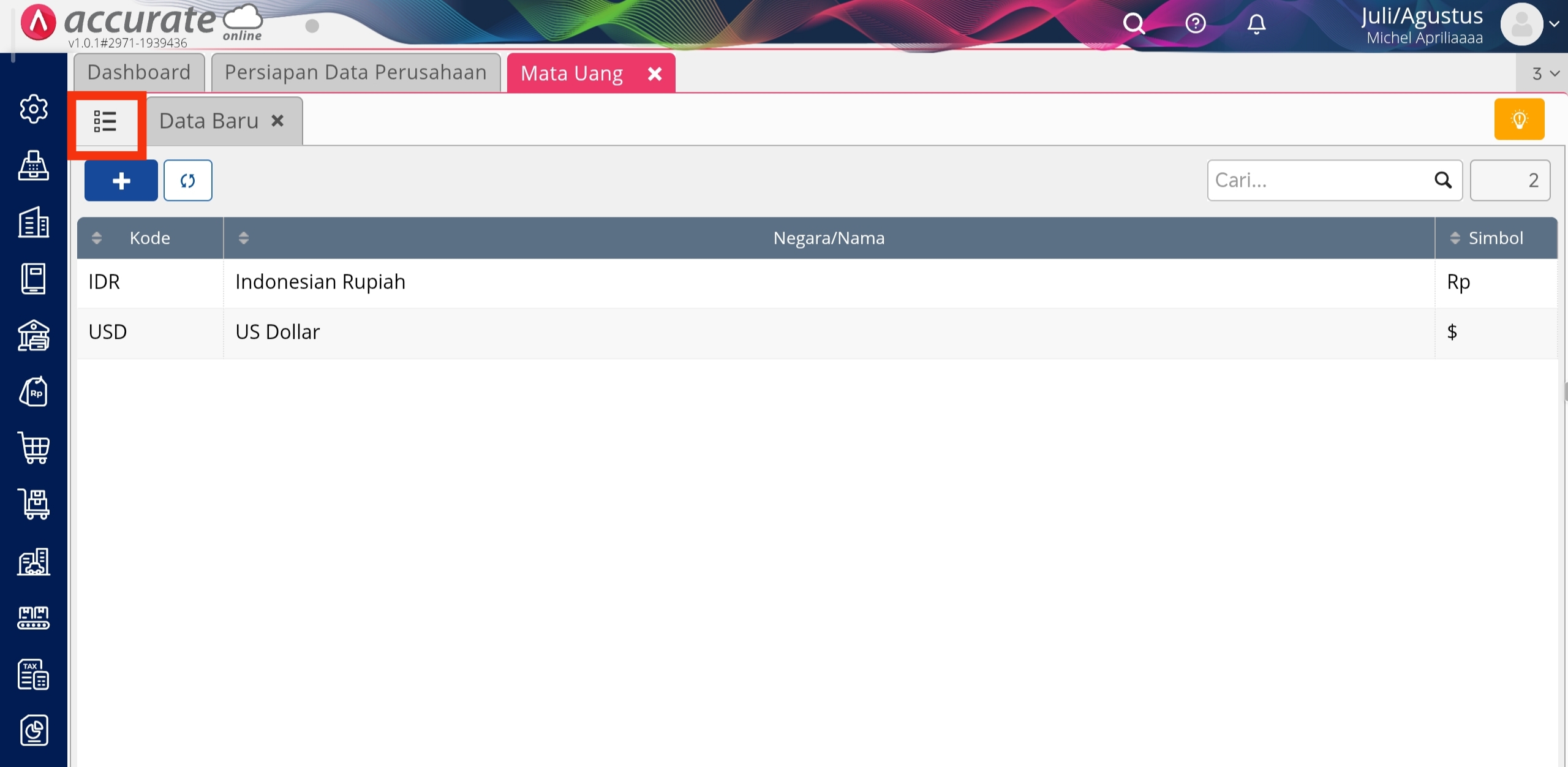 - Selanjutnya ke menu Perusahaan | Mata Uang, lalu buka daftar mata uang dengan klik tombol Daftar (di samping tab Data Baru).