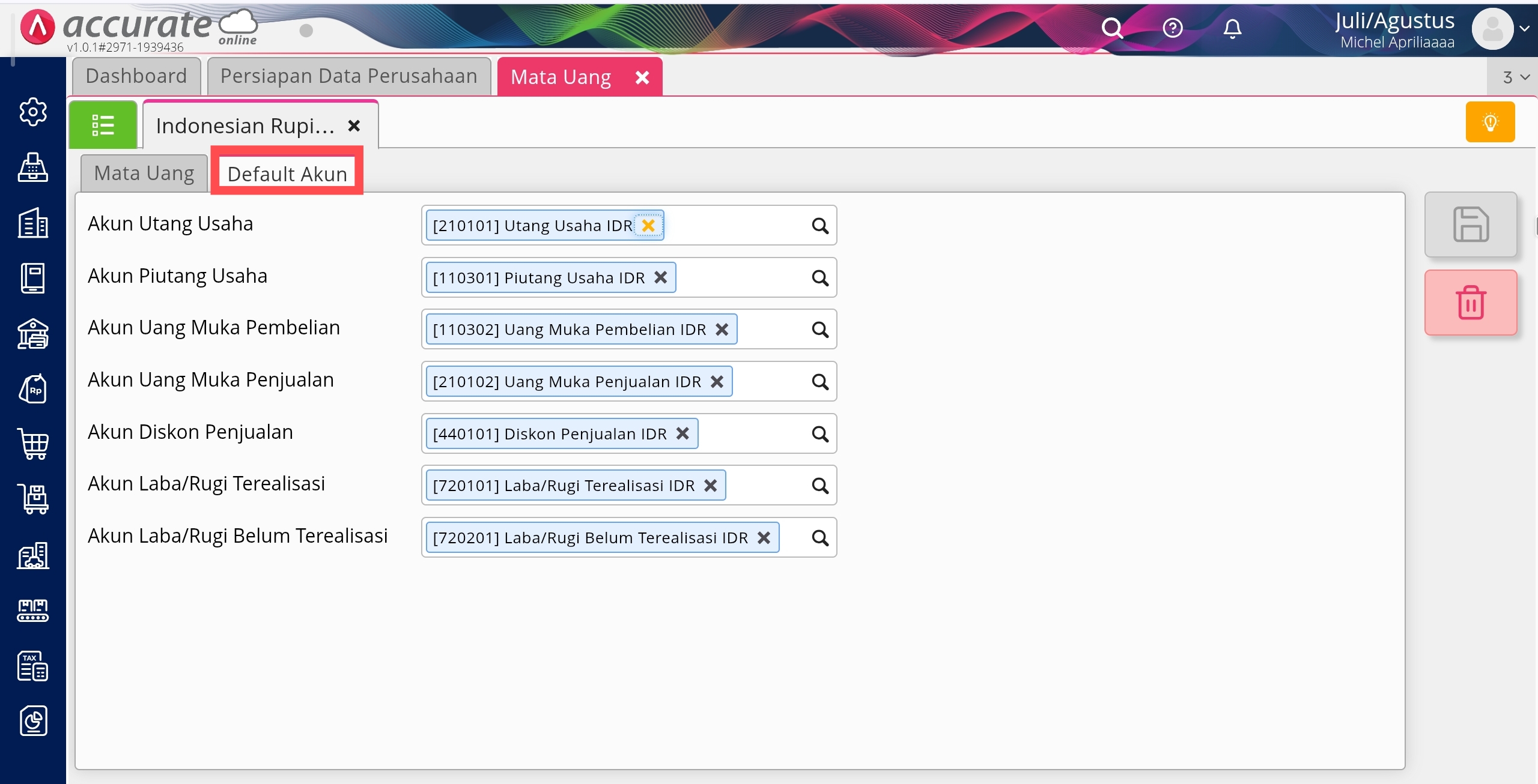 - Pilih Mata Uang Indonesian Rupiah | klik tab Default Akun, kemudian cek apakah Uang Muka Pembelian IDR digunakan pada salah satu Default Akun di mata uang tersebut.