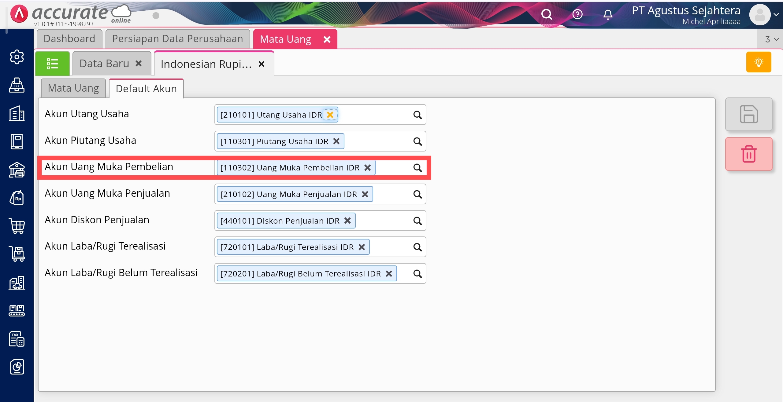 - Akun Uang Muka Pembelian IDR digunakan sebagai default akun untuk Akun Uang Muka Pembelian. Silakan ganti default akun untuk Akun Uang Muka Pembelian IDR dengan akun lainnya, kemudian Simpan.