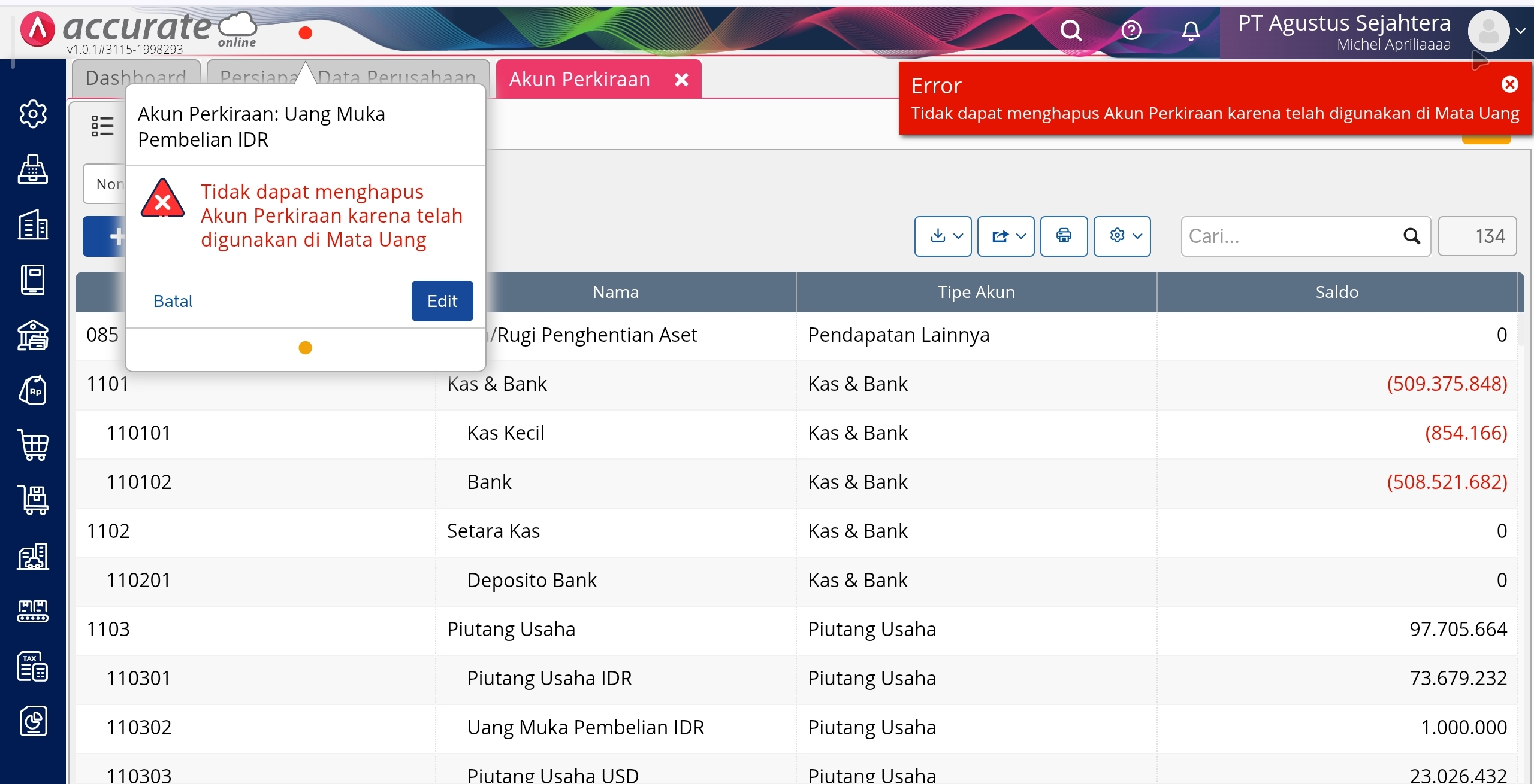 Tampil pesan error “Tidak Dapat Menghapus Akun Perkiraan karena telah digunakan di Mata Uang” saat menghapus akun perkiraan dari menu Buku Besar | Akun Perkiraan. Hal ini dikarenakan akun yang akan dihapus tersebut digunakan pada default akun dari Mata Uang yang sesuai dengan mata uang dari akun yang bersangkutan.