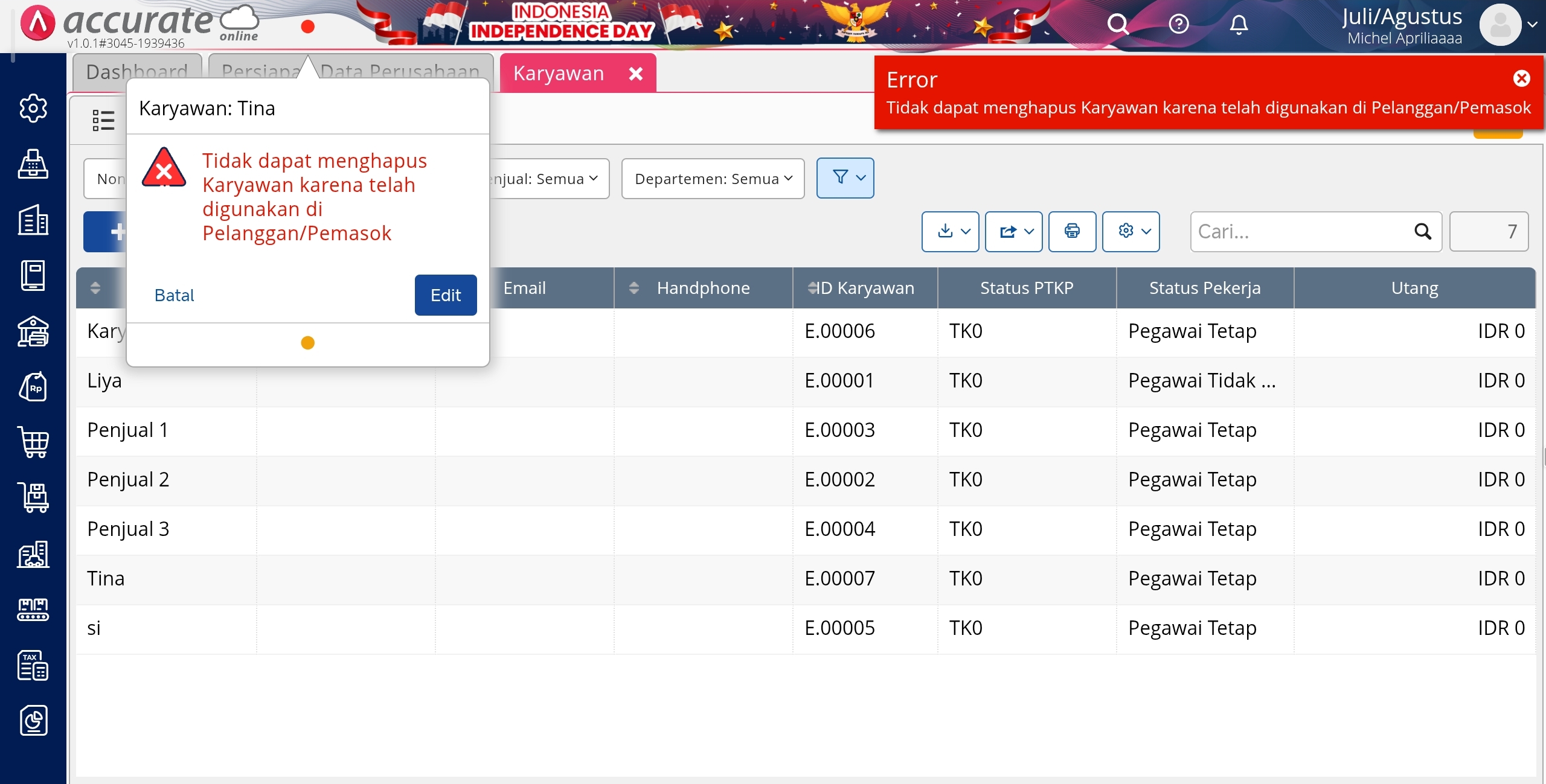 Pesan eror yang tampil tersebut terjadi dikarenakan karyawan yang hendak dihapus, digunakan sebagai Default Penjual pada salah satu pelanggan.