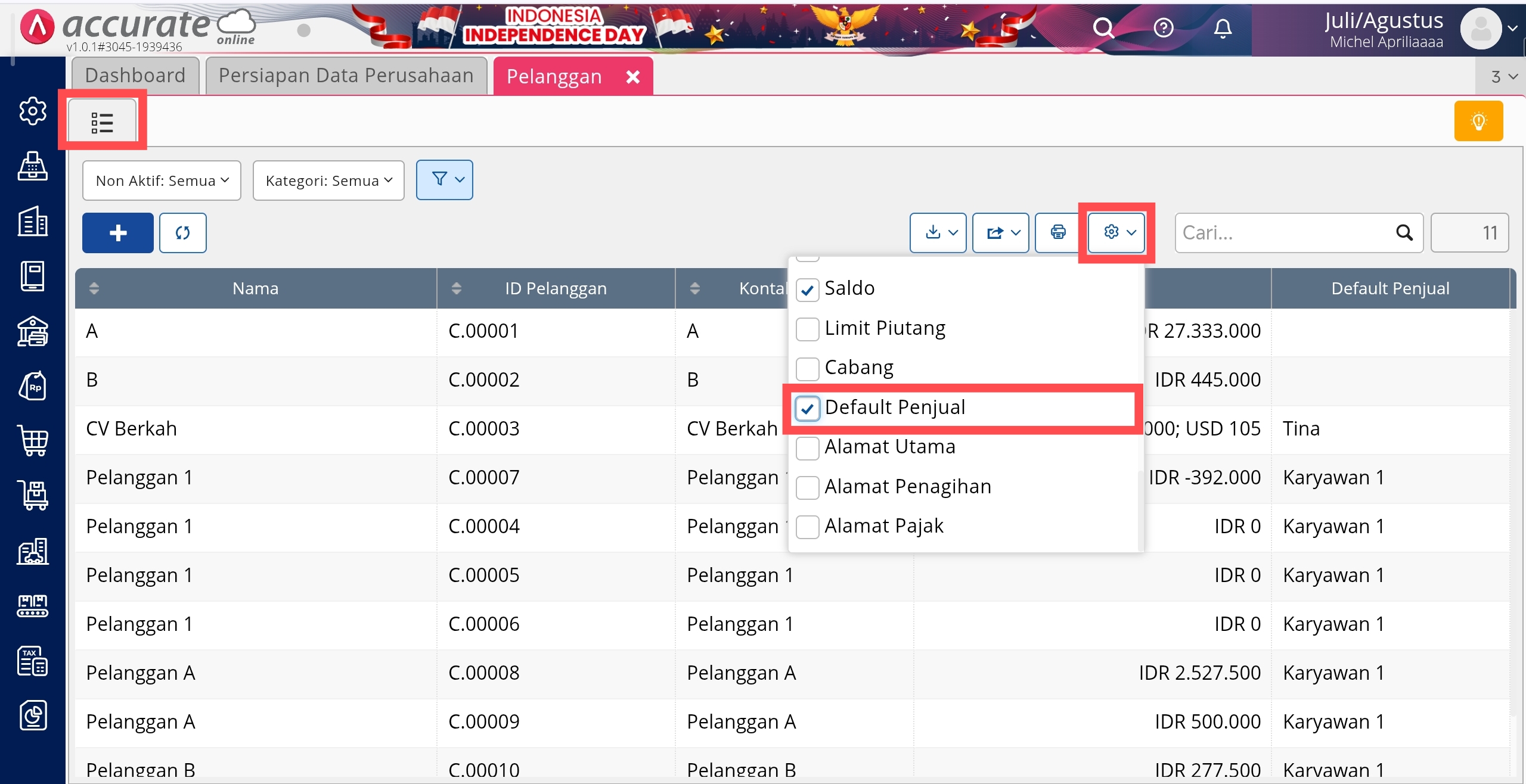 - Buka daftar Pelanggan, lalu klik tombol Pengaturan, kemudian centang Default Penjual dan akan tampil nama Default Penjual pada Daftar Pelanggan.