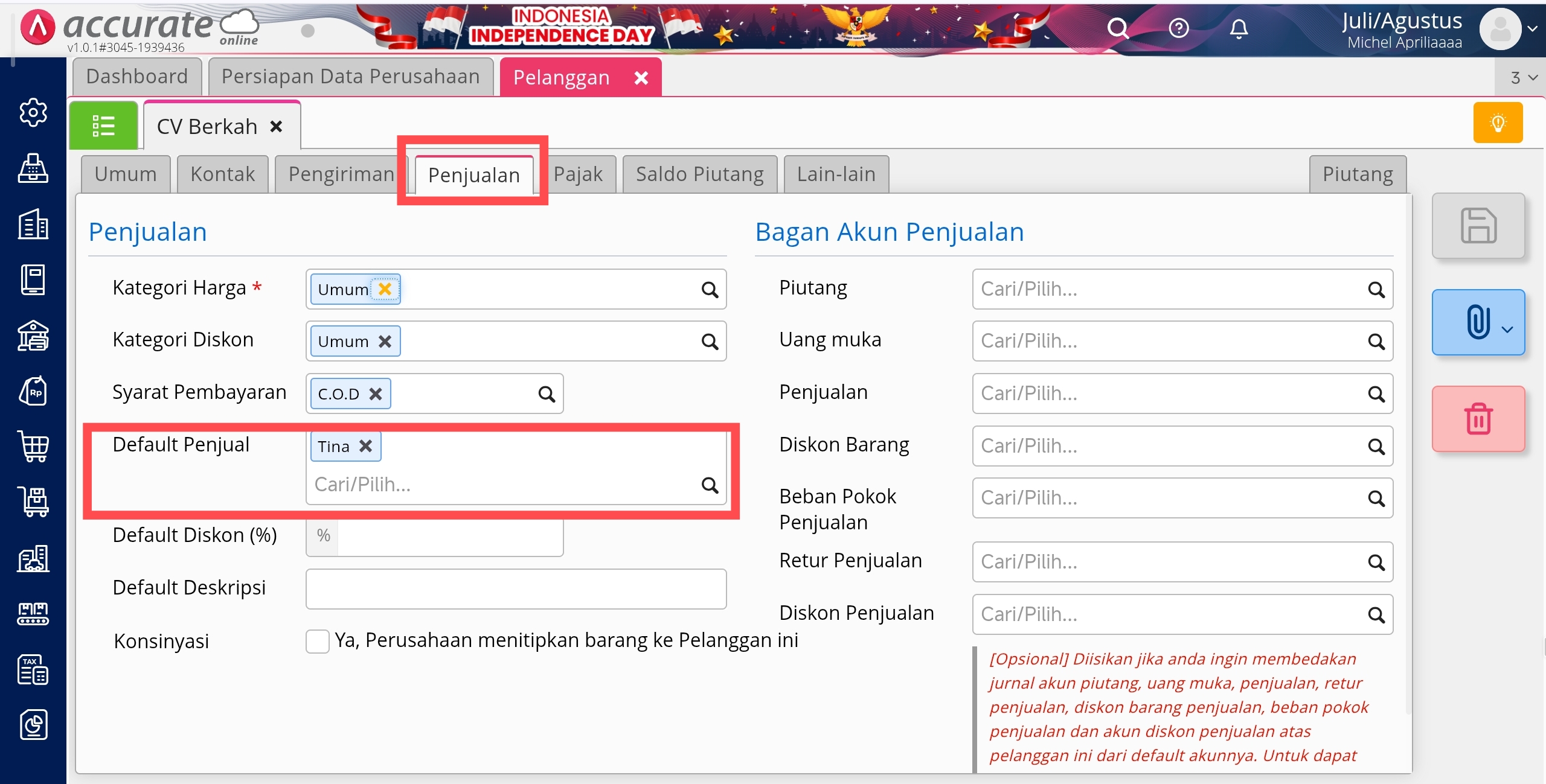 - Pilih Nama Pelanggan dengan Default Penjual yang dimaksud, lalu ke tab Penjualan dan silahkan hapus Nama Penjual pada kolom Default Penjual.