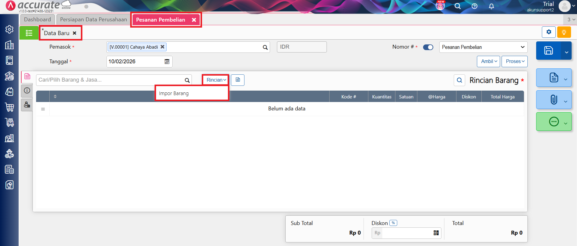 - Pada tab Data Baru, isikan beberapa informasi seperti Pemasok, Tanggal, dan Nomor #. Selanjutnya, klik Rincian dan pilih Impor Barang.