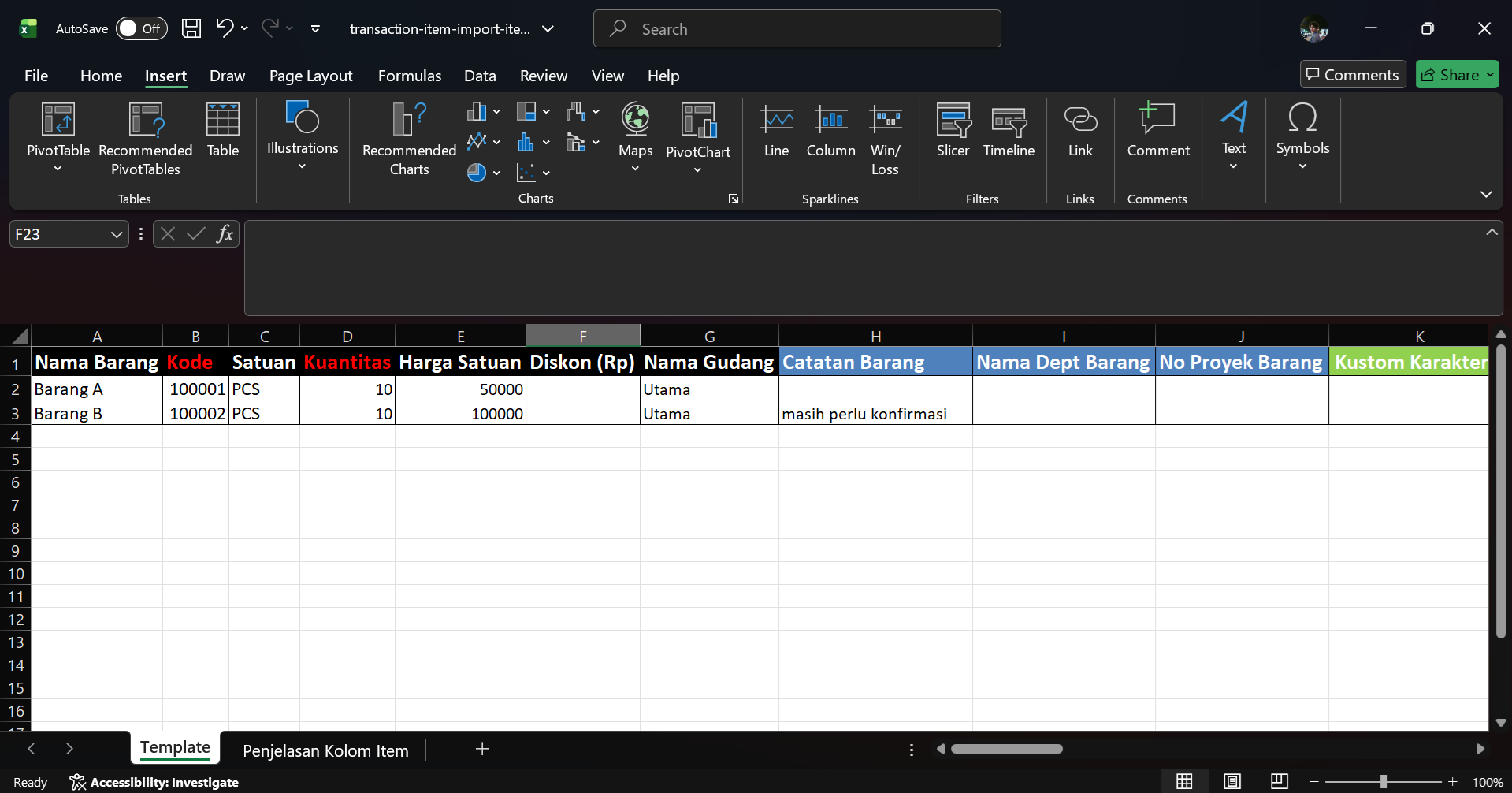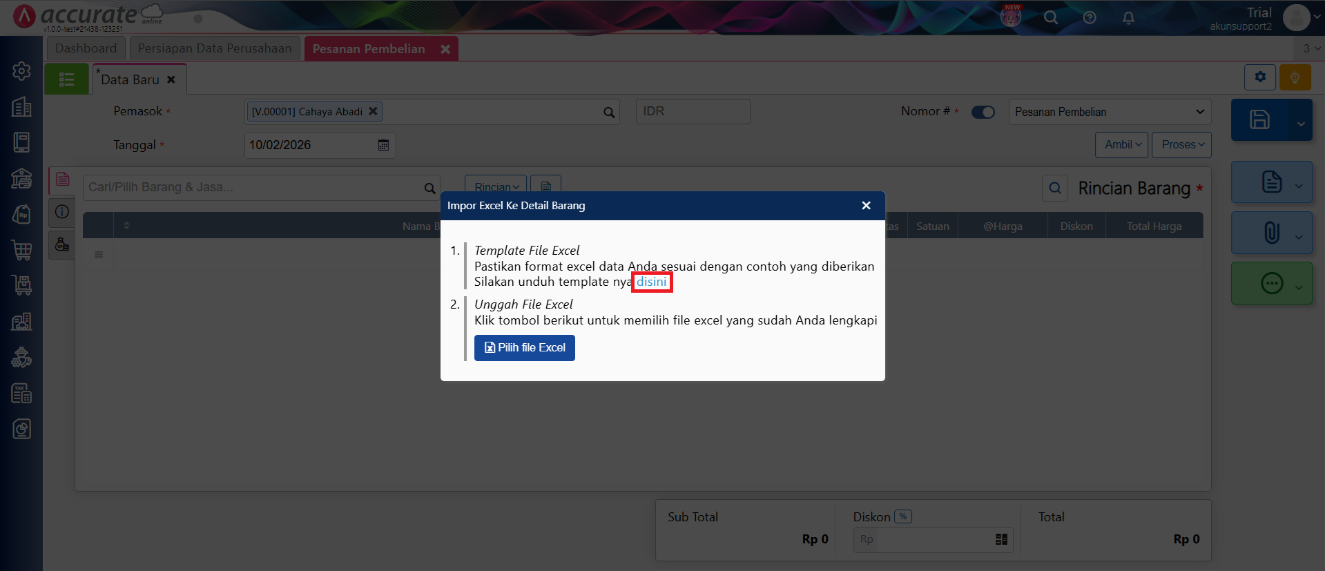 - Silahkan unduh format file-nya, yaitu dengan cara klik informasi ‘Disini‘ pada bagian Impor Excel ke Detail Barang.