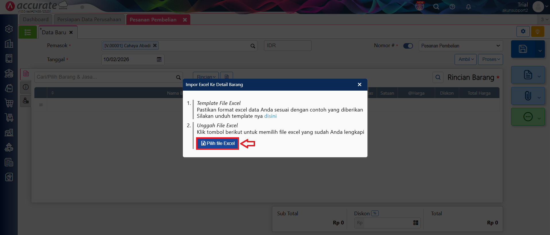 Berikut langkah-langkah impor barang pada transaksi Pesanan Pembelian melalui file Excel atau CSV:
