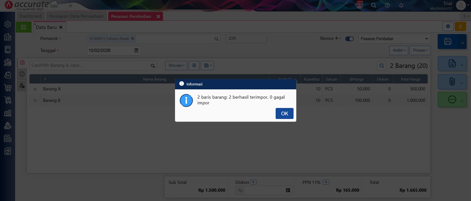 - Tampilan saat data excel berhasil terimpor ke Accurate.