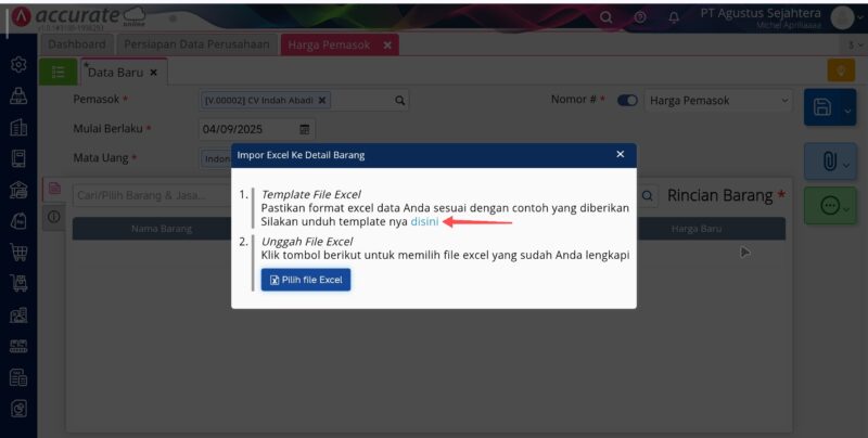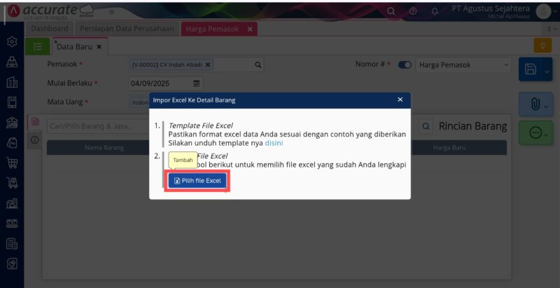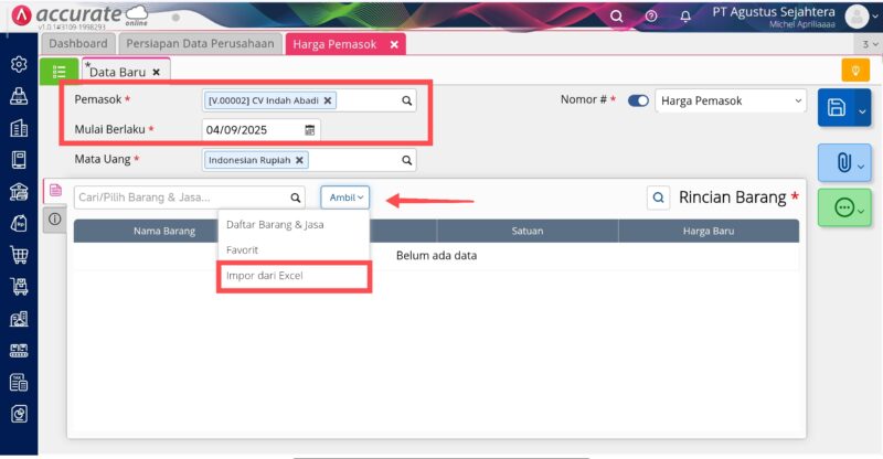 Berikut ini langkah-langkah melakukan impor Harga Pemasok dari file Excel :