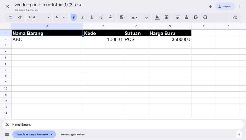 - Lengkapi data-data yang sesuai pada file excel tersebut, seperti data Nama Barang, Kode barang, Satuan (Tidak Wajib) dan Harga Baru untuk barang dengan Pemasok tersebut.