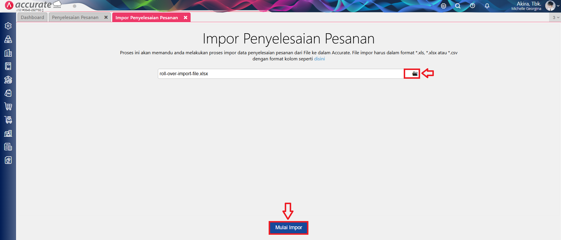 - Silahkan download format file-nya, yaitu dengan cara klik informasi ‘Disini‘ pada bagian Impor Penyelesaian Pesanan.