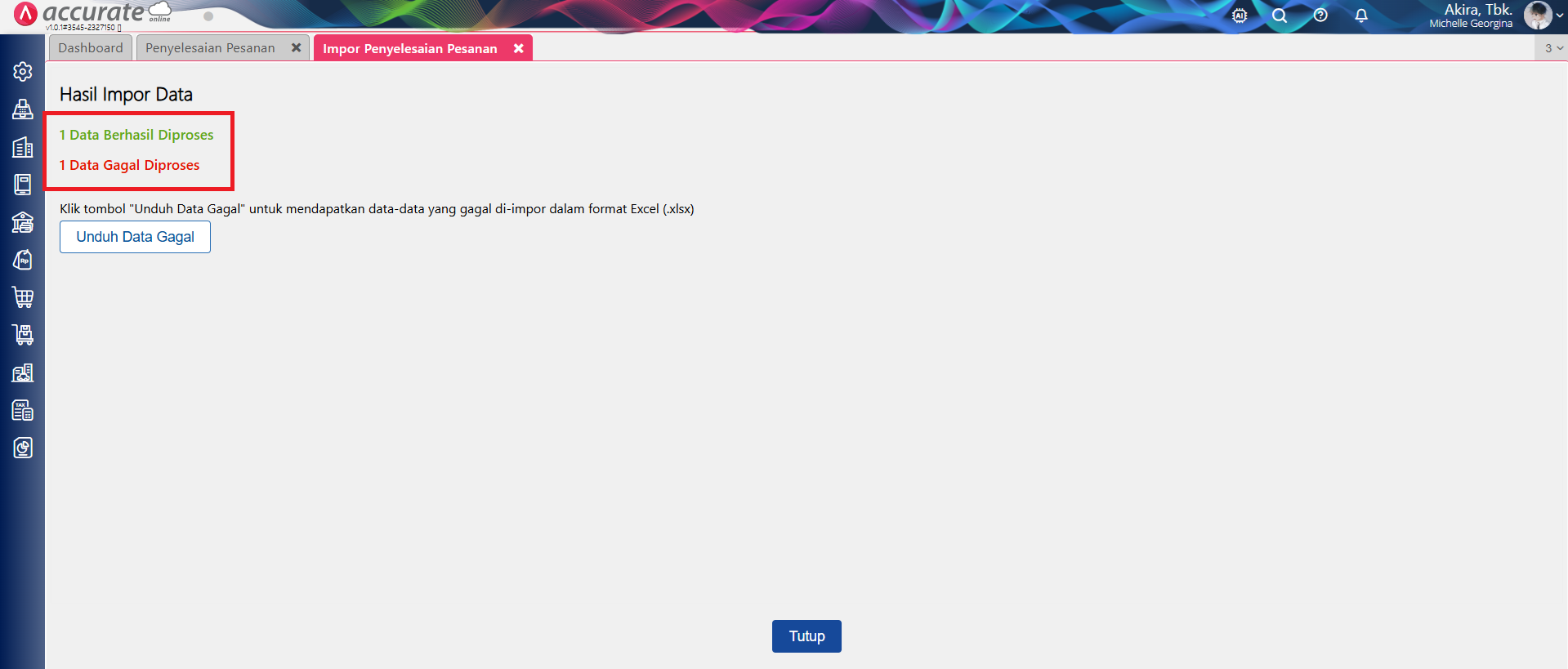 - Setelah proses impor selesai, akan tampil informasi beberapa data yang berhasil terimpor dan jumlah data yang gagal (jika ada). Jika ada data transaksi yang gagal di-impor, silahkan klik ‘Unduh Data Gagal‘ untuk mengetahui penyebab errornya.