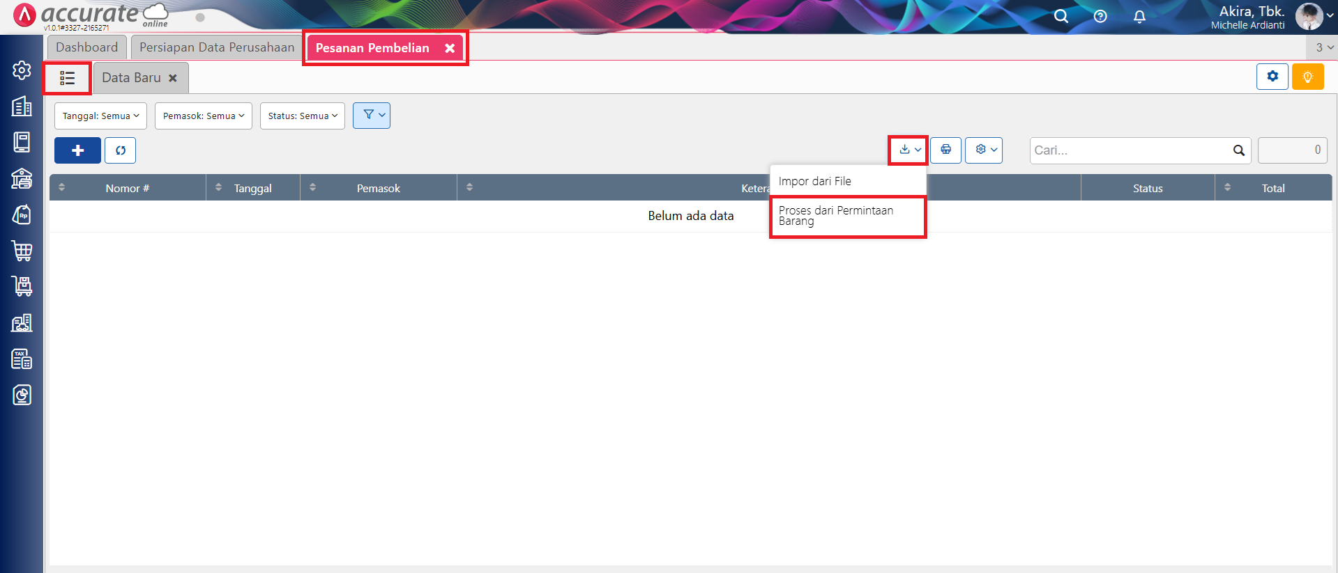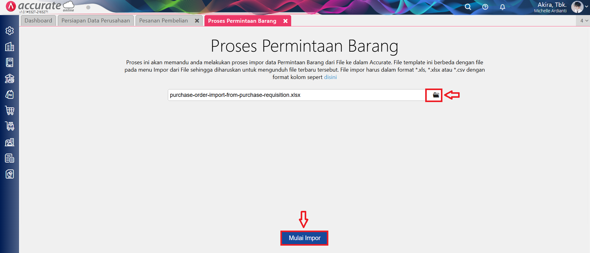 Berikut langkah-langkah impor transaksi Pesanan Pembelian dari Permintaan Barang melalui file Excel atau CSV:
