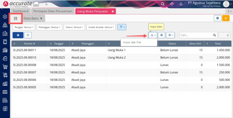 - Lalu ke Daftar Uang Muka Penjualan | Impor Data lalu klik Impor Dari File.