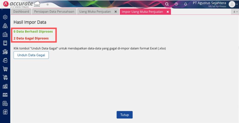 - Setelah proses impor selesai akan tampil informasi berapa data yang berhasil terimpor dan jumlah data yang gagal (jika ada). Jika ada data transaksi yang gagal di-impor silakan klik “Unduh Data Gagal” untuk mengetahui penyebab errornya.