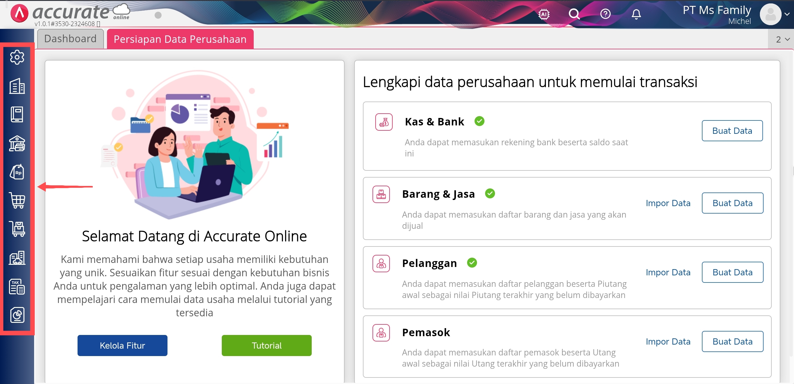 - Pada halaman data usaha Accurate Online Anda, arahkan kursor mouse ke bagian kiri halaman data usaha Anda.