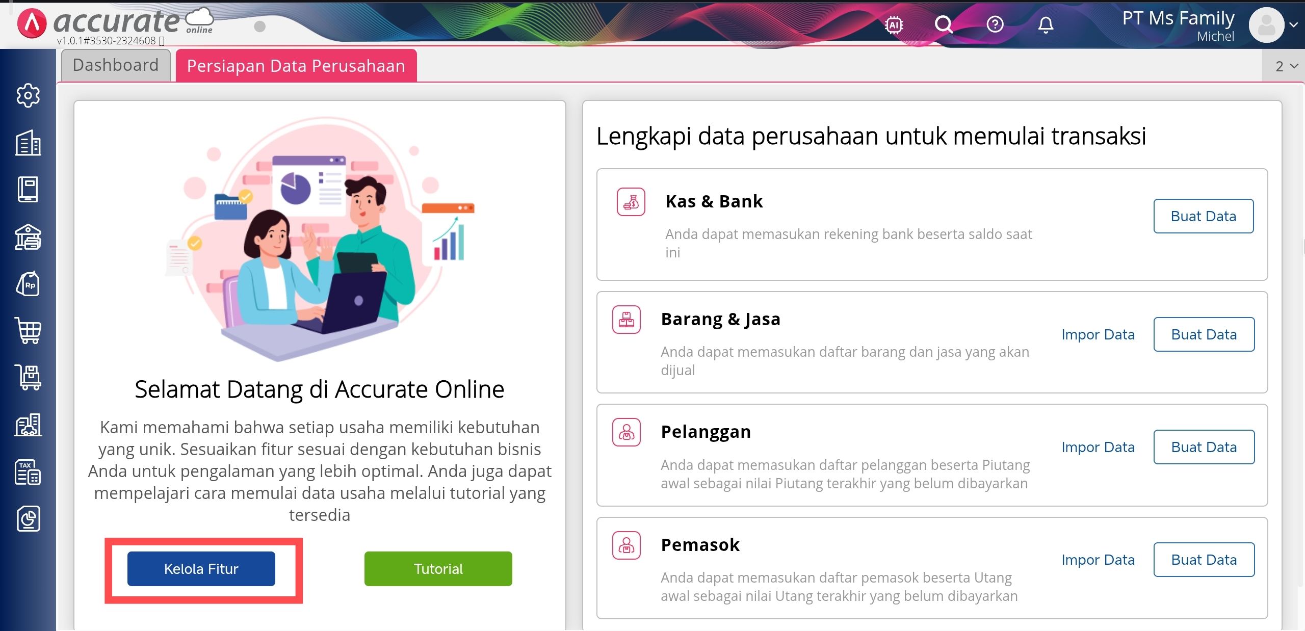 Pada halaman Persiapan Data Perusahaan, klik pada ‘Kelola Fitur’ kemudian Anda akan diarahkan ke menu Preferensi di bagian Fitur. Pada langkah ini, Anda perlu menentukan fitur-fitur apa saja yang Anda butuhkan dalam melakukan pencatatan transaksi keuangan bisnis Anda.