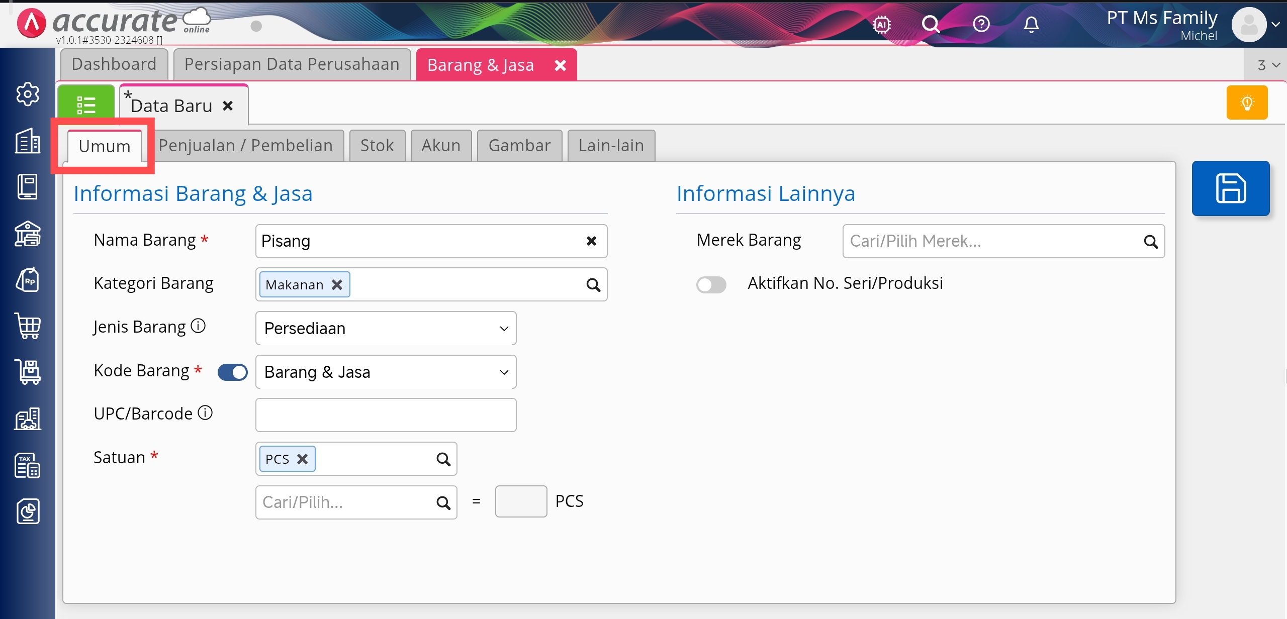 Lengkapi informasi yang tersedia terkait dengan data barang/jasa Anda, mulai dari tab Umum sampai dengan tab Gambar. Namun yang utama adalah pengisian Kode Barang dan Nama Barang pada tab Umum.