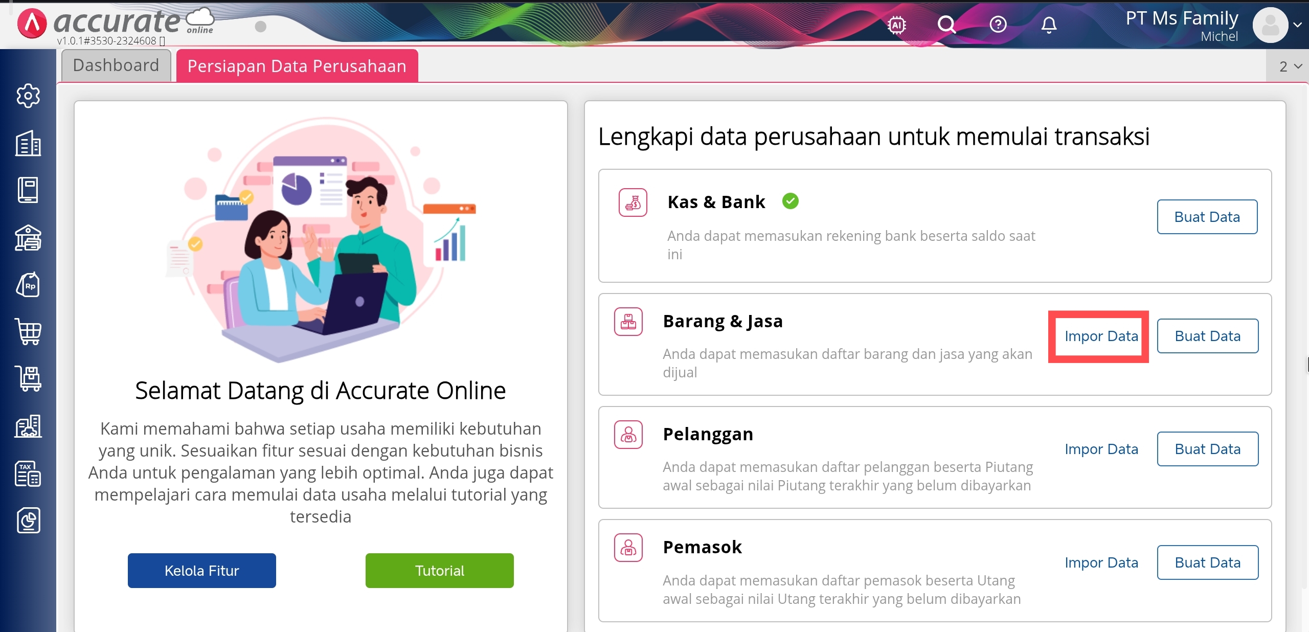 Selain melakukan penginputan satu per satu, data Barang dan Jasa bisa diimport dari file excel ke Data Usaha Accurate Online Anda. Silakan klik ‘Impor Data’ pada halaman Persiapan Data Perusahaan dibagian Barang & Jasa.