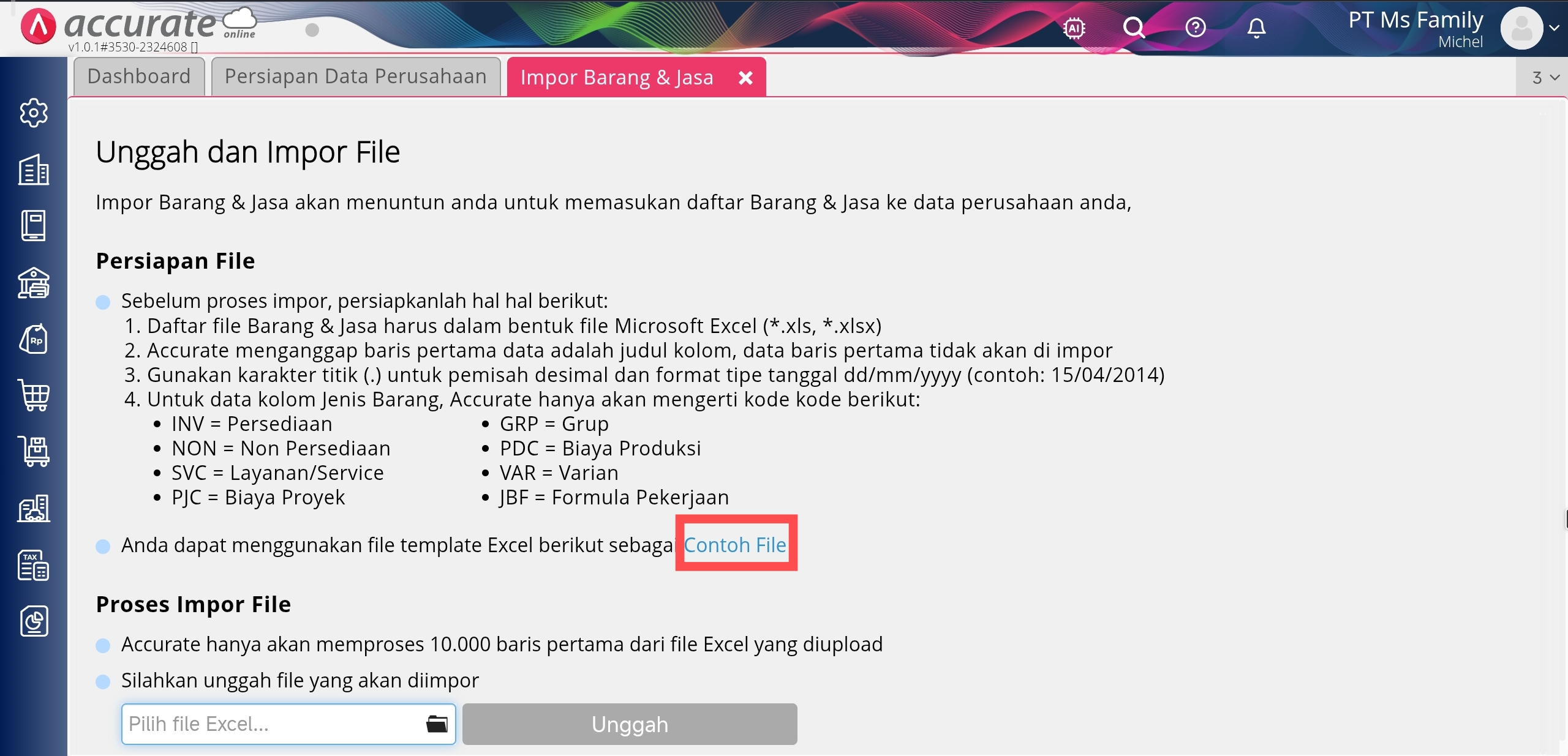 Selanjutnya akan tampil halaman Impor Barang & Jasa. Silakan klik ‘Contoh File’ untuk mengunduh format file excel impor barang & jasa ke Data Usaha Accurate Online.