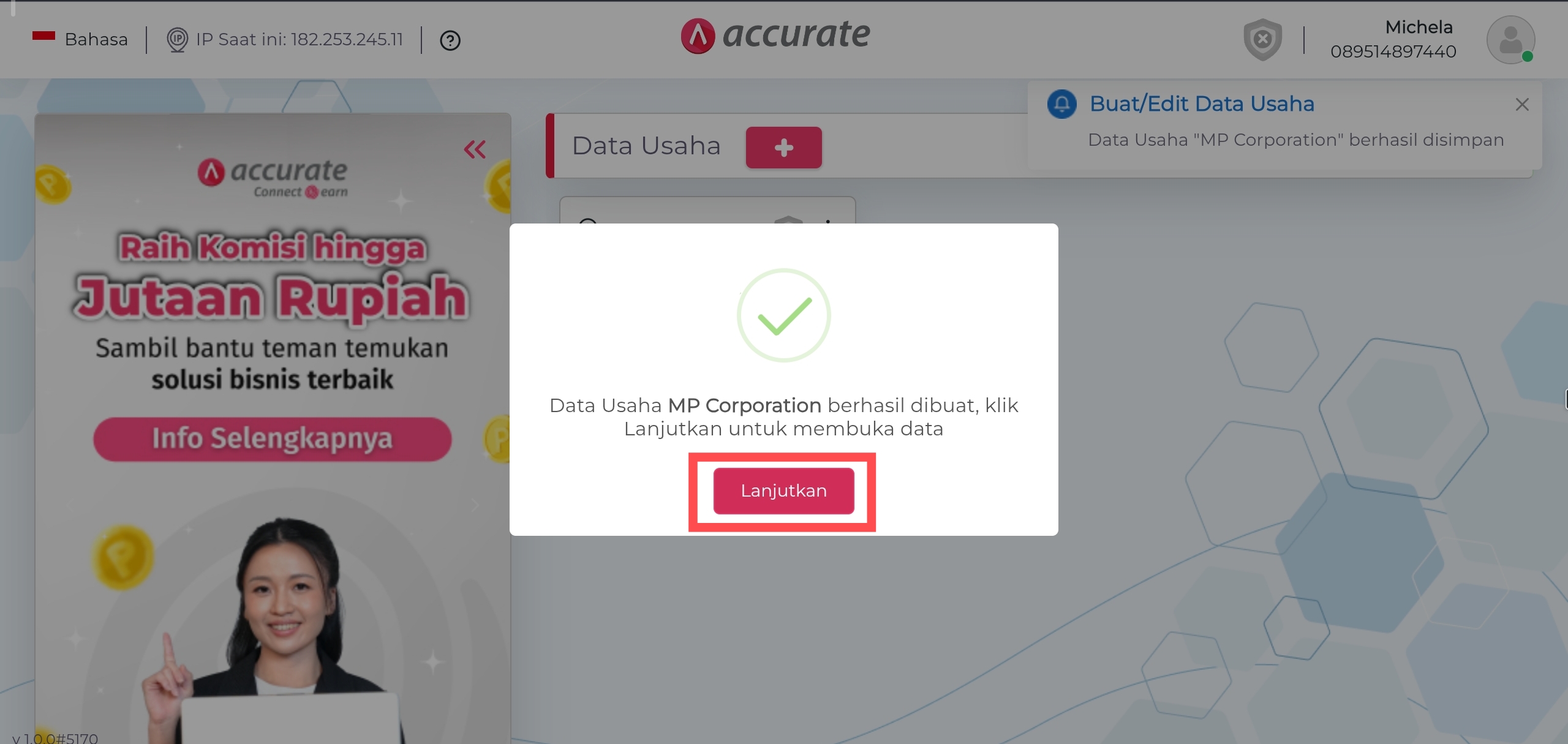 3. Tunggu hingga proses pembuatan data usaha selesai dilakukan yaitu sampai terdapat notifikasi ‘Data usaha telah berhasil dibuat’, lalu klik Lanjutkan.