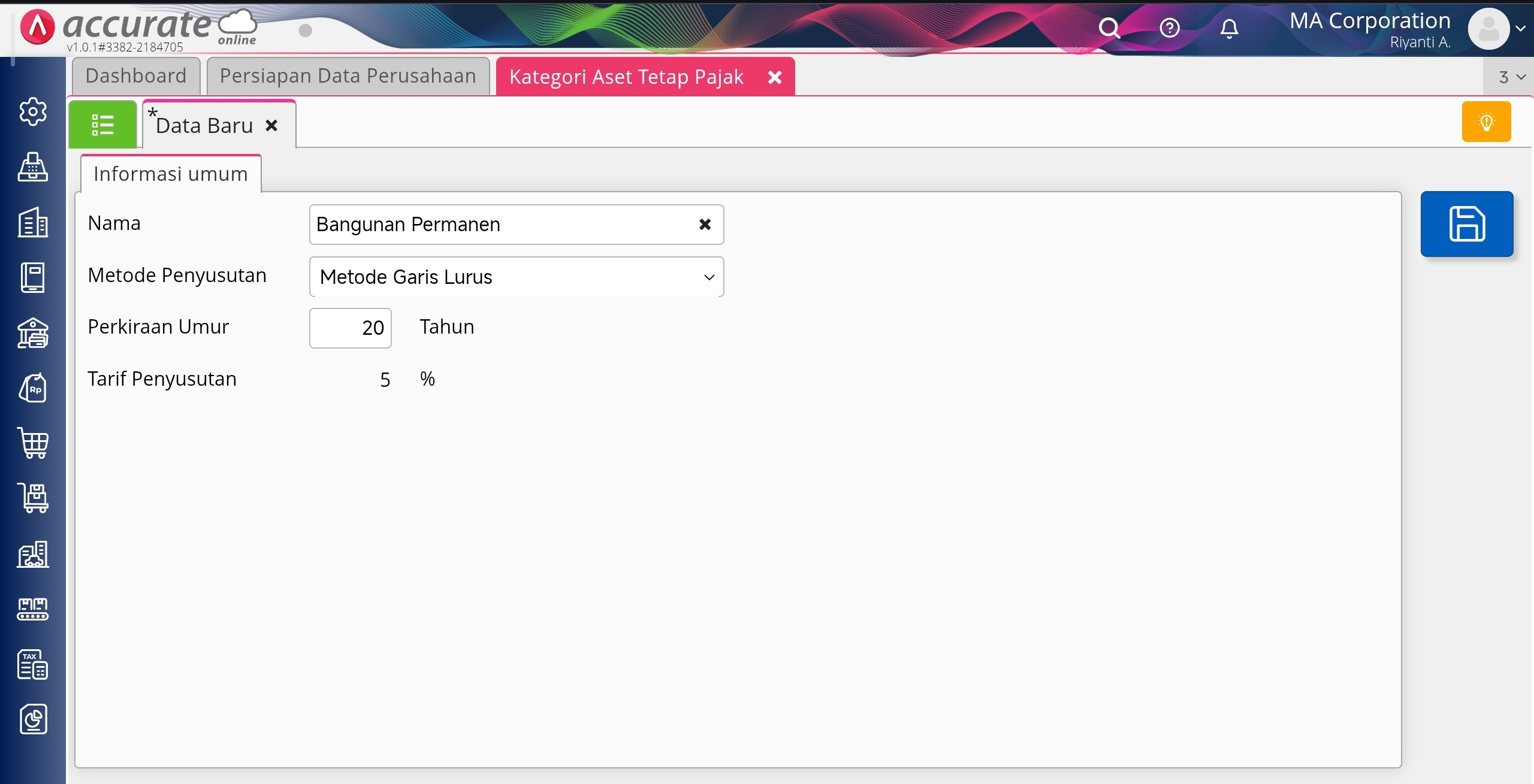 2. Lengkapi informasi Nama Kategori Aset Tetap Pajak, Metode Penyusutan dan Umur Aset Tetap.