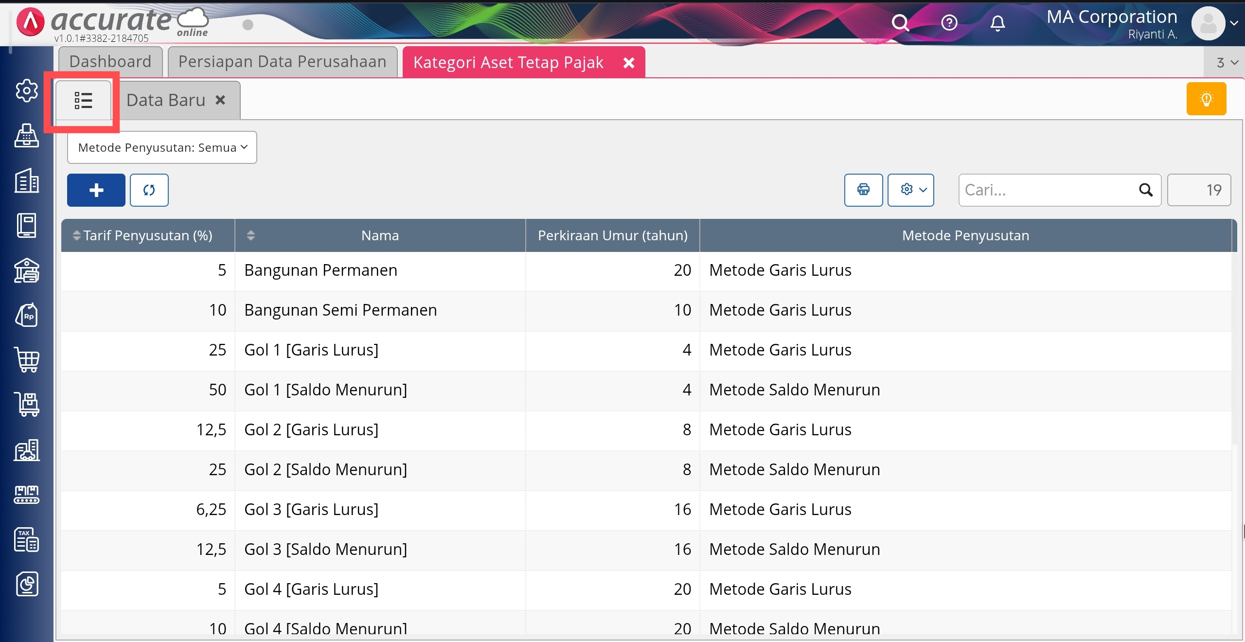 4. Untuk melihat Daftar Kategori Aset Tetap Pajak yang telah Anda buat, klik tombol daftar di samping tab Data Baru.