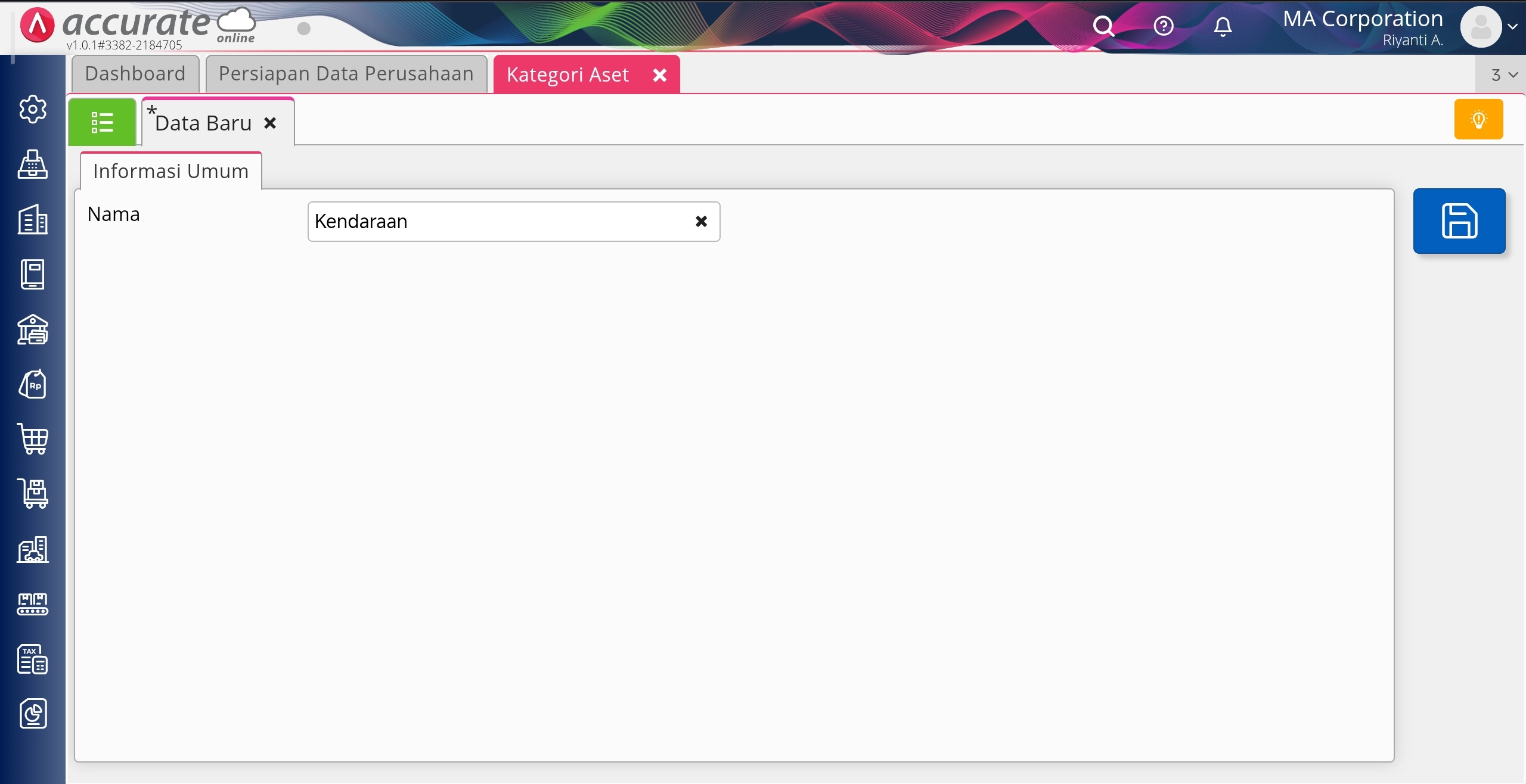 2. Tentukan Kategori Aset yang Anda buat pada field Nama, lalu klik Simpan.
