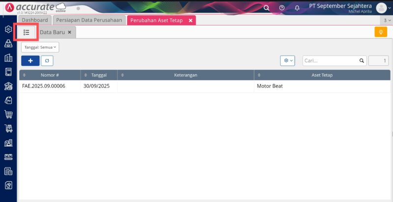 - Ke menu Aset Tetap | Perubahan Aset Tetap.