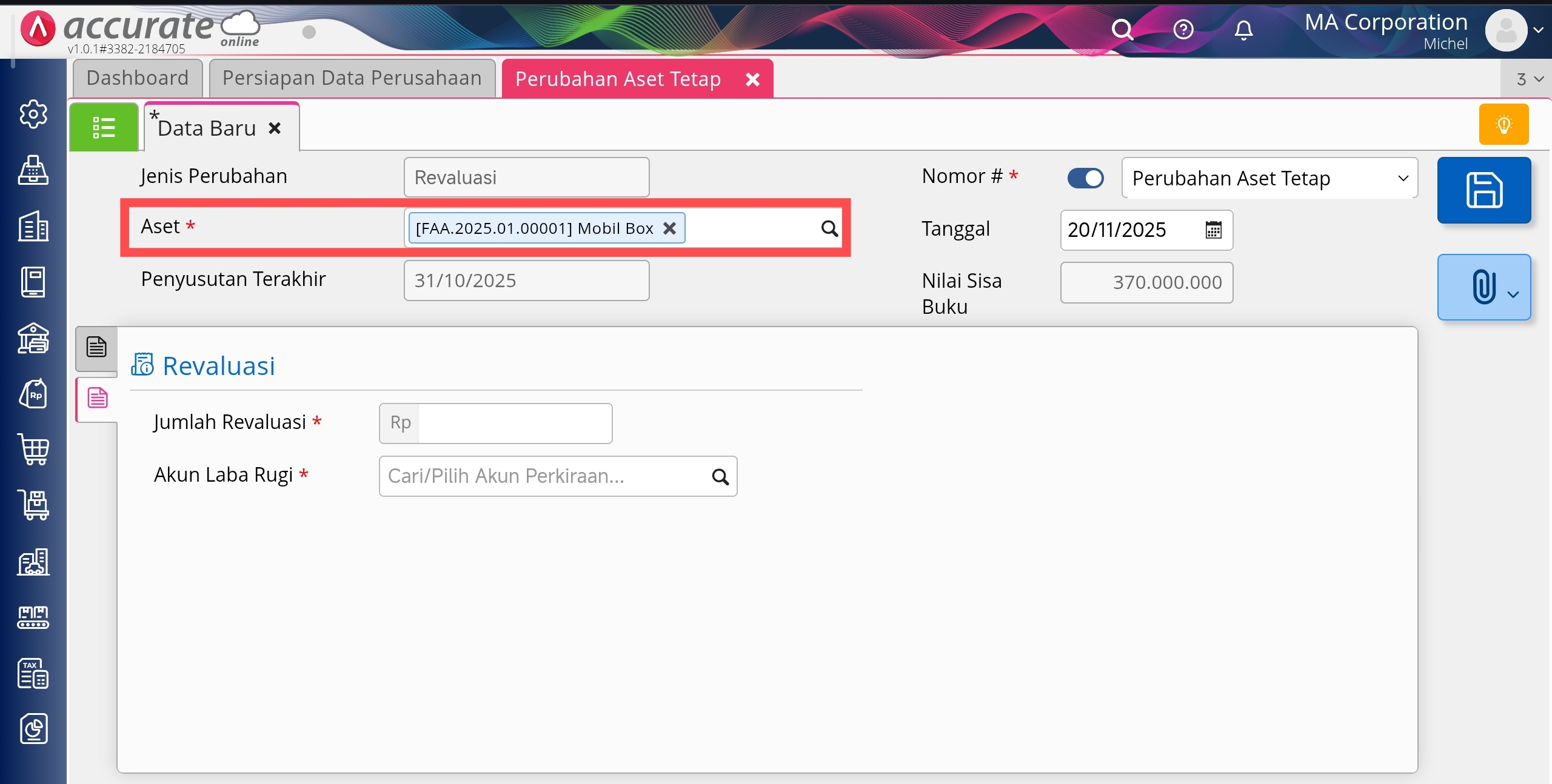 3. Pada tab Revaluasi, kolom Jumlah isi dengan nilai yang diinginkan, sedangkan pada Akun Laba Rugi, isi dengan akun penampung laba rugi atas proses revaluasi tsb.