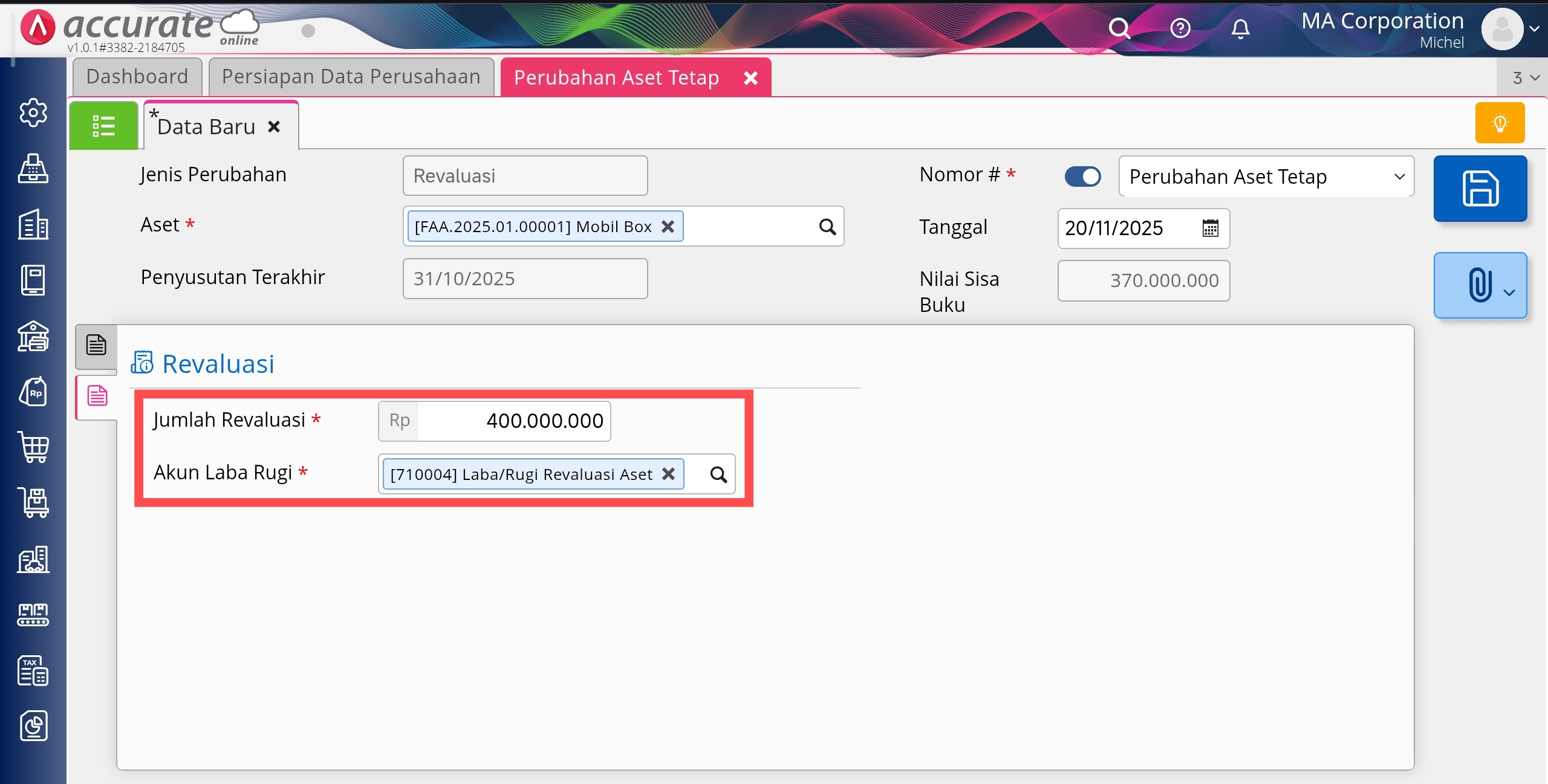 Ilustrasi: terdapat aset tetap yang sudah disusutkan sampai dengan saat ini dan nilai bukunya masih senilai 370.000.000, tetapi jika dilakukan taksiran atas aset tetap tsb nilainya masih 400.000.000, maka Anda bisa melakukan Revaluasi untuk mengubah nilai dari 370.000.000 menjadi 400.000.000