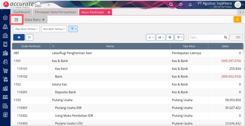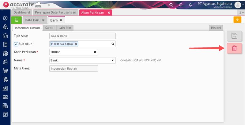 Pada Accurate Online disediakan cara untuk menghapus akun perkiraan yang telah dibuat. Tetapi sebelum menghapus, Anda harus dapat memastikan bahwa akun tsb tidak dalam kondisi memiliki transaksi atau digunakan pada default akun barang ataupun default akun yang lain, atau akun tsb bukanlah induk akun.