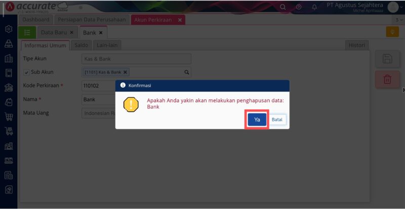 4. Selanjutnya akan tampil konfirmasi penghapusan, Anda klik Ya untuk mengkonfirmasi penghapusan akun perkiraan tsb.