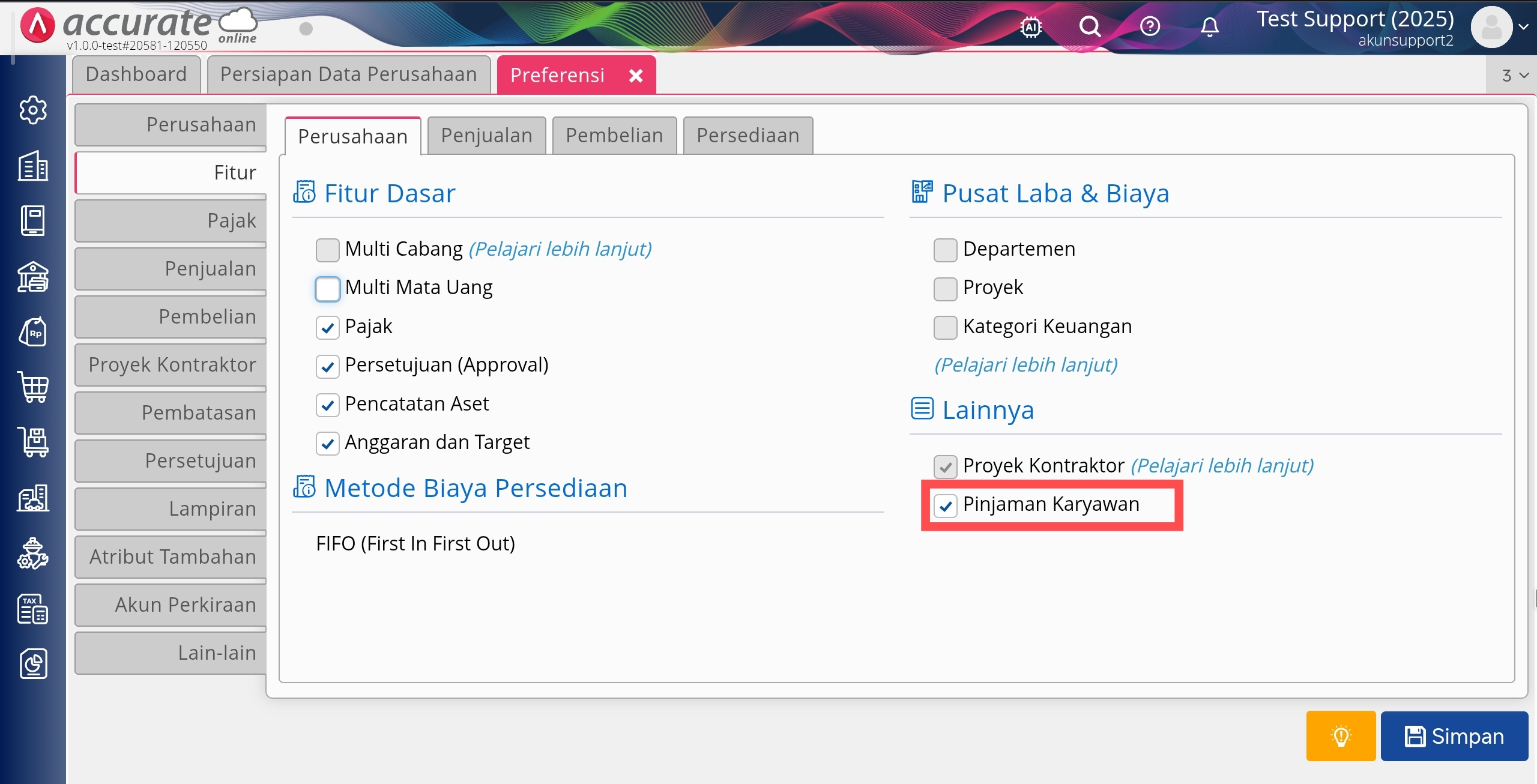 - Aktifkan fitur Pinjaman Karyawan di menu Pengaturan | Preferensi | Fitur, lalu pada tab Perusahaan bagian Lainnya, centang informasi Pinjaman Karyawan dan klik Simpan. Fitur Pinjaman Karyawan tampil di menu Buku Besar.