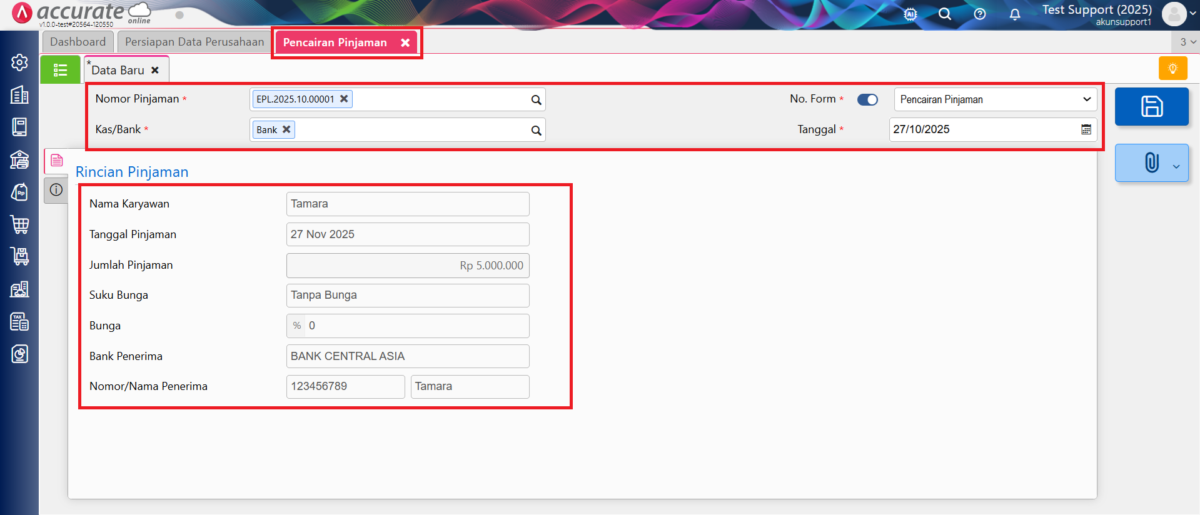 - Jika sudah sesuai, Simpan atas Pinjaman Karyawan tersebut, dan lakukan proses Pencairan Pinjaman melalui menu Kas & Bank | Pencairan Pinjaman.