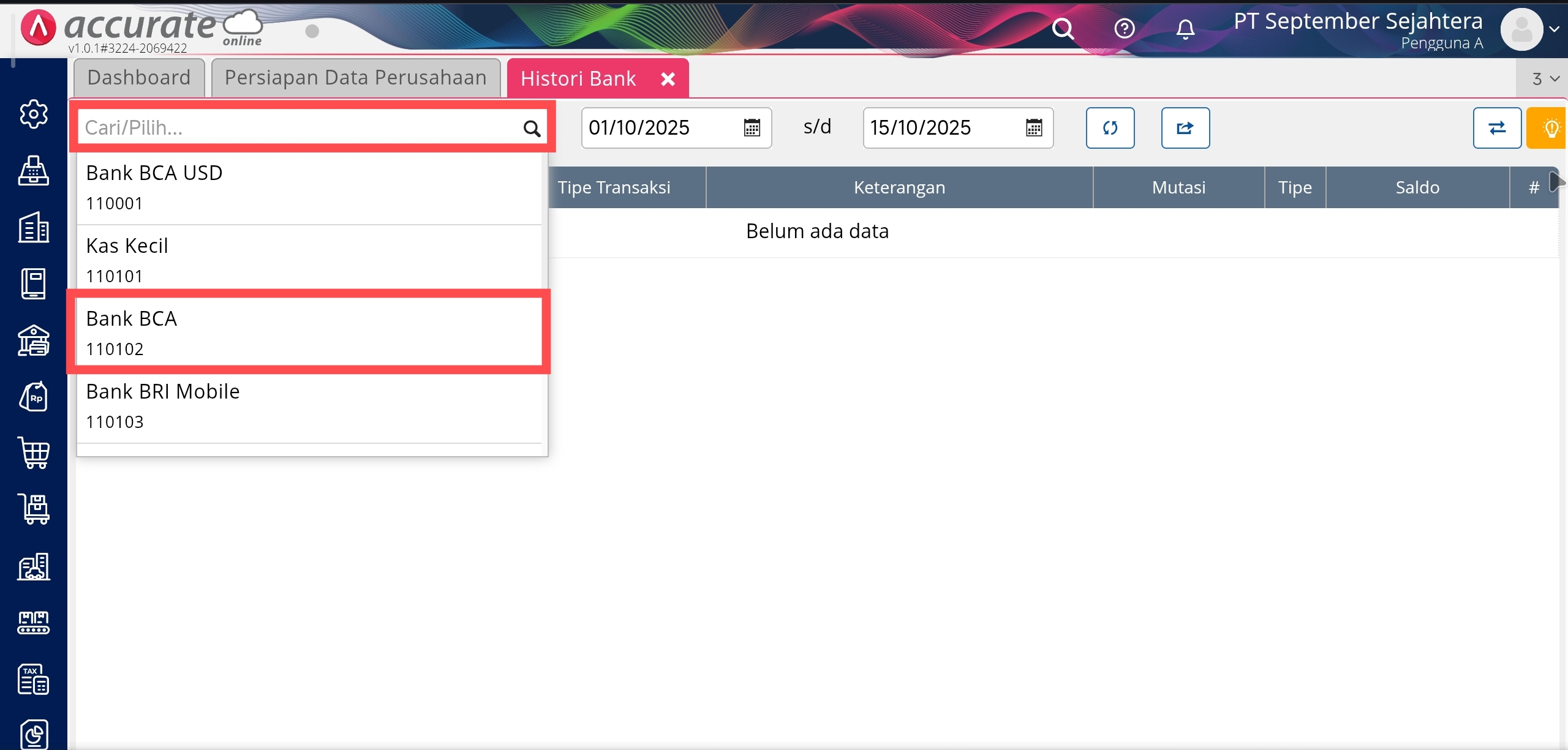 2. Tentukan akun kas/bank yang akan Anda lihat mutasi atau historinya dengan mengklik pada bagian Cari/Pilih. Kemudian pada bagian tanggal tentukan batasan mutasi yang ingin disajikan dari akun kas/bank tsb.
