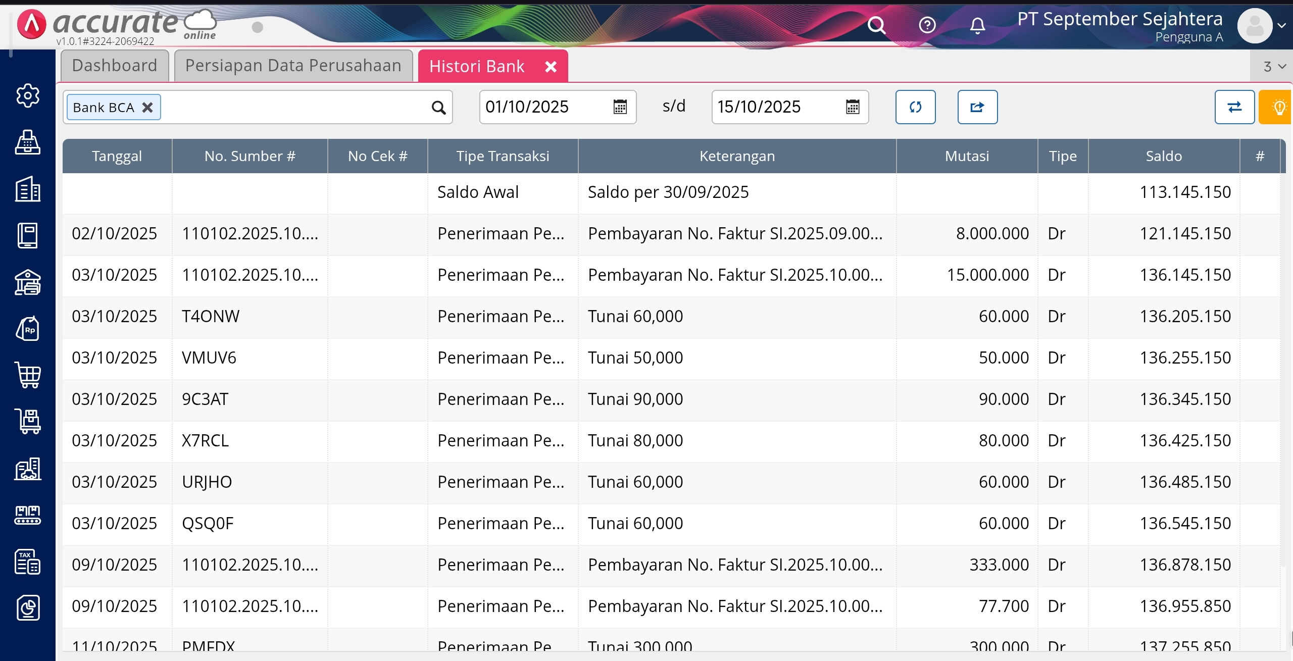 Untuk melihat daftar mutasi atau histori dari suatu akun kas/bank adalah sbb :