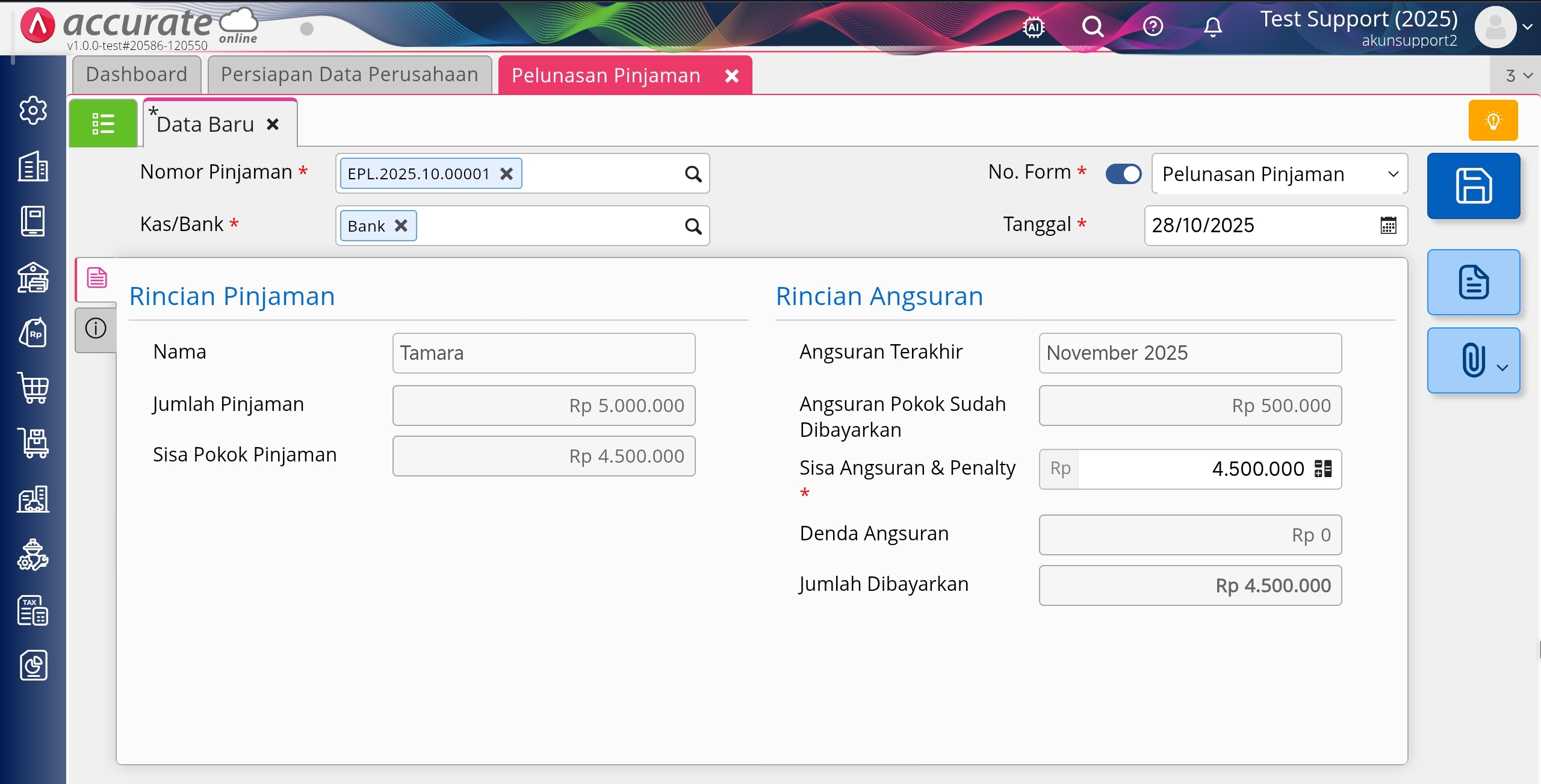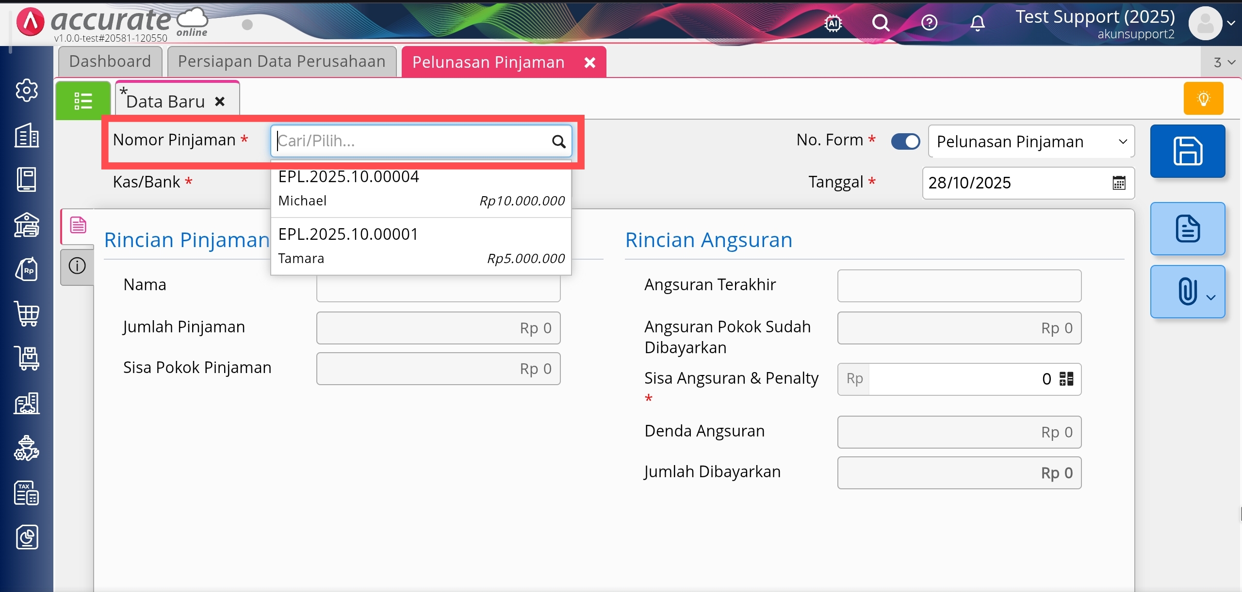 - Pilih Nomor Pinjaman yang akan dilakukan pelunasan, Kas/Bank yang digunakan untuk menerima pelunasan, dan Tanggal dilakukannya pelunasan pinjaman.