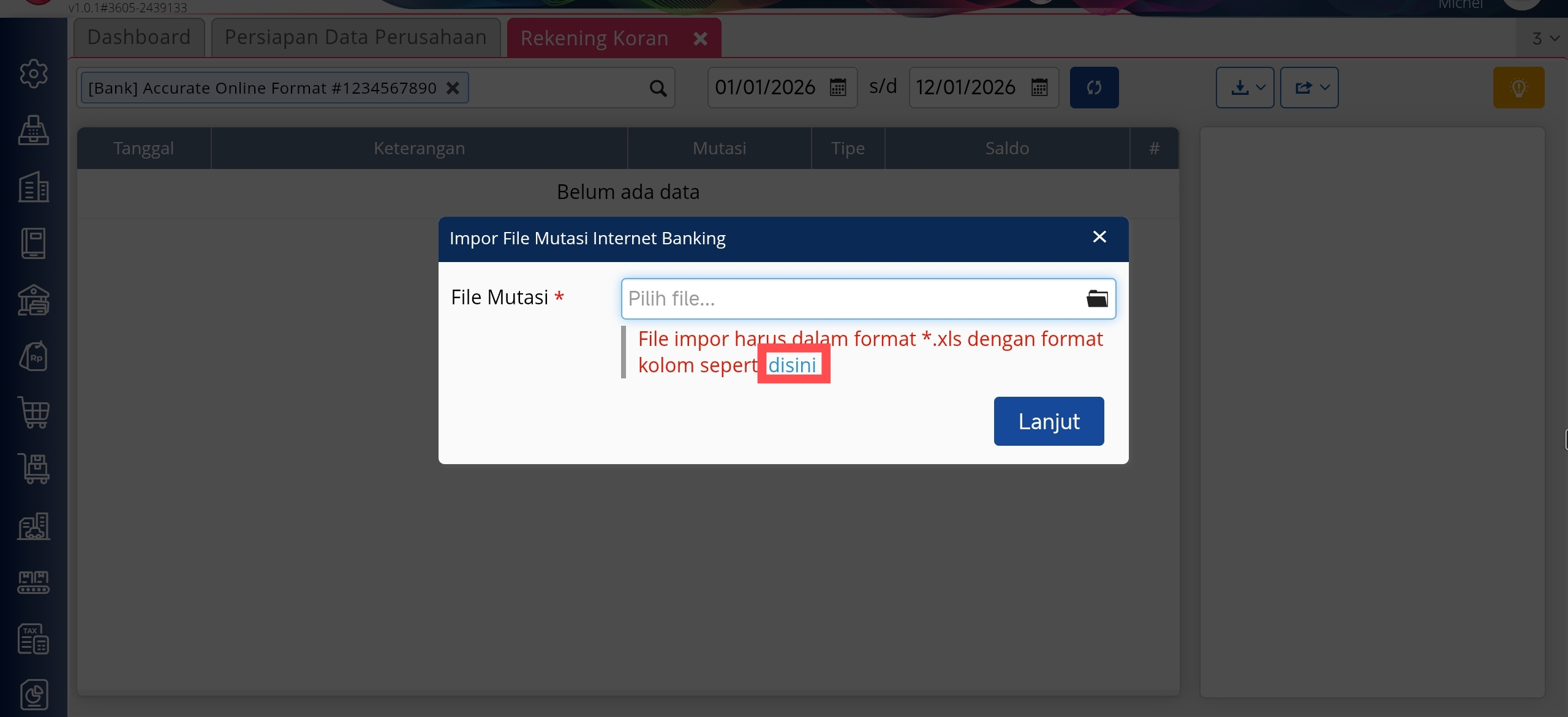 3. Lakukan impor file mutasi dengan klik Impor Data | Impor File Mutasi. Apabila menggunakan SmartLink e-Banking Accurate Online Format, maka akan tampil template impor file mutasinya dengan klik informasi “disini”.