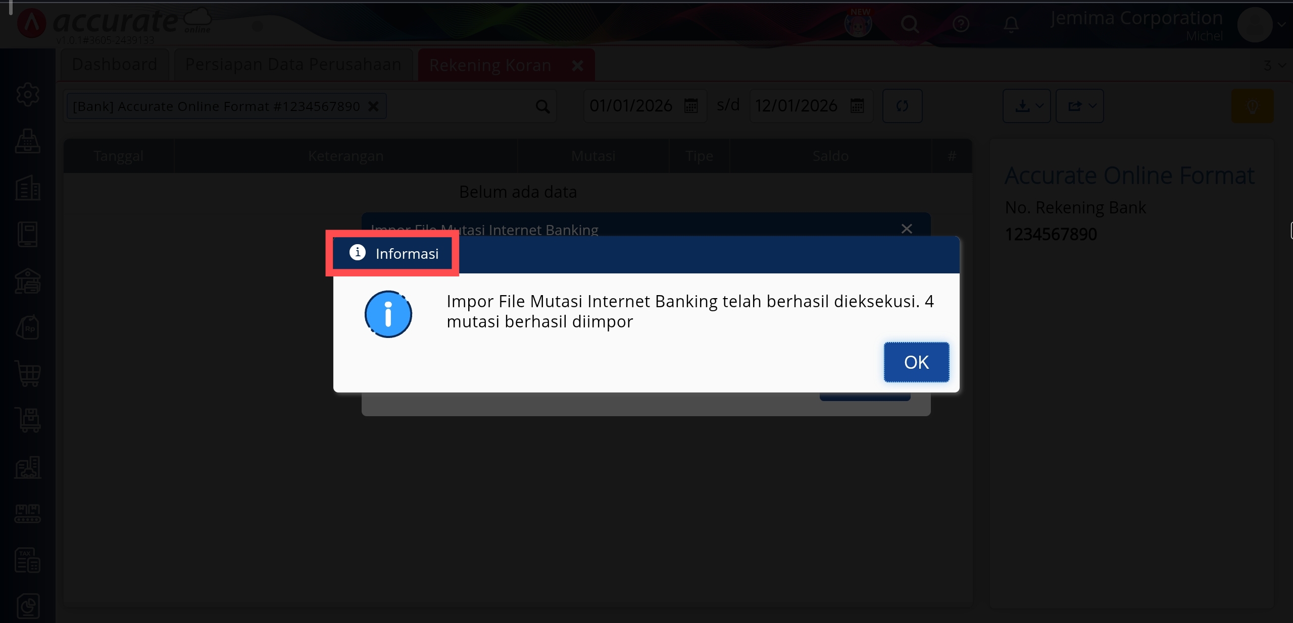 Informasi hasil impor mutasi rekening