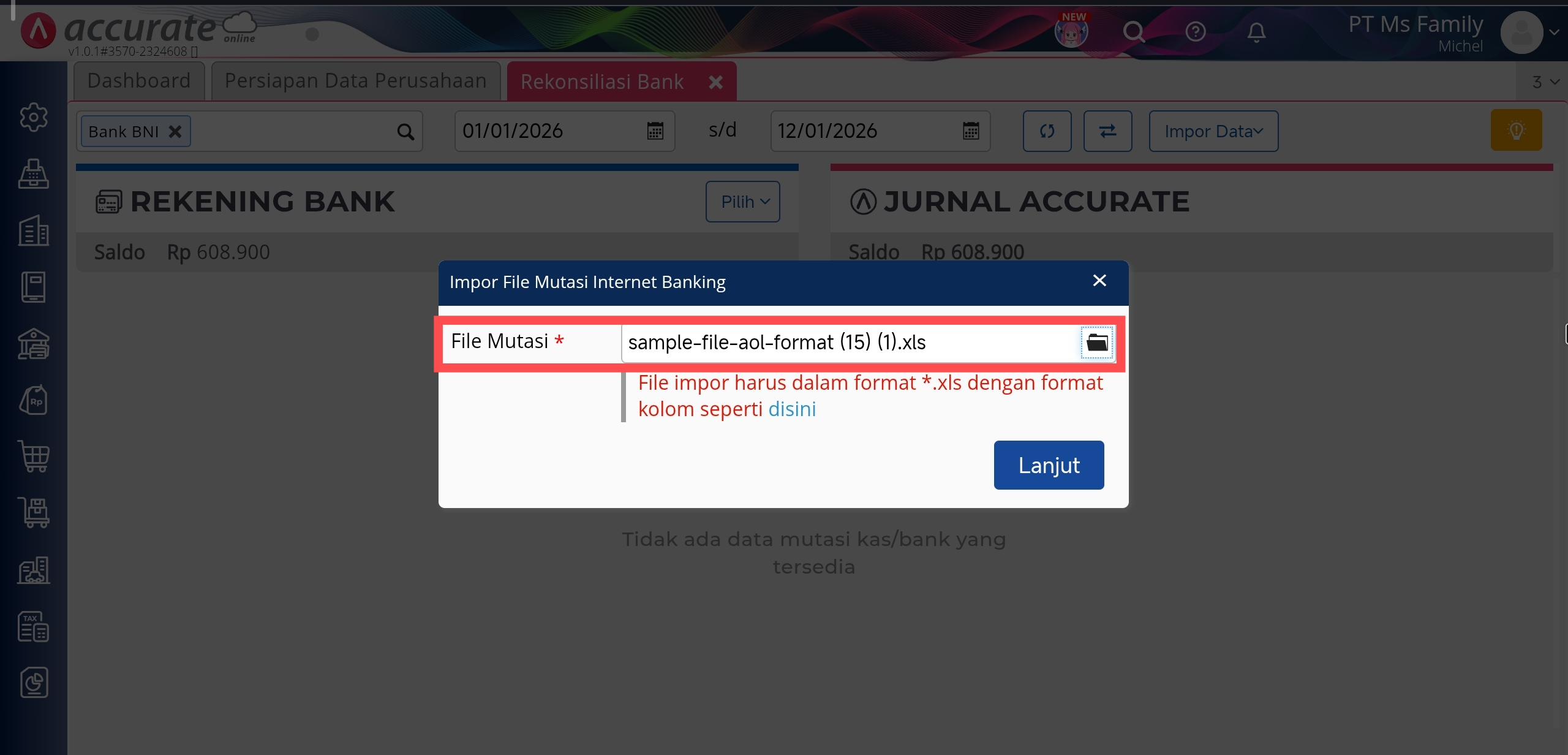 5. Klik Lanjut dan tunggu sampai ada konfirmasi ‘Impor Internet Banking telah berhasil di eksekusi’, yang menandakan proses impor transaksi telah berhasil dilakukan dan transaksi pada kolom Rekening Koran akan terisi sesuai dengan rekening koran pada Bank yang telah anda Impor.