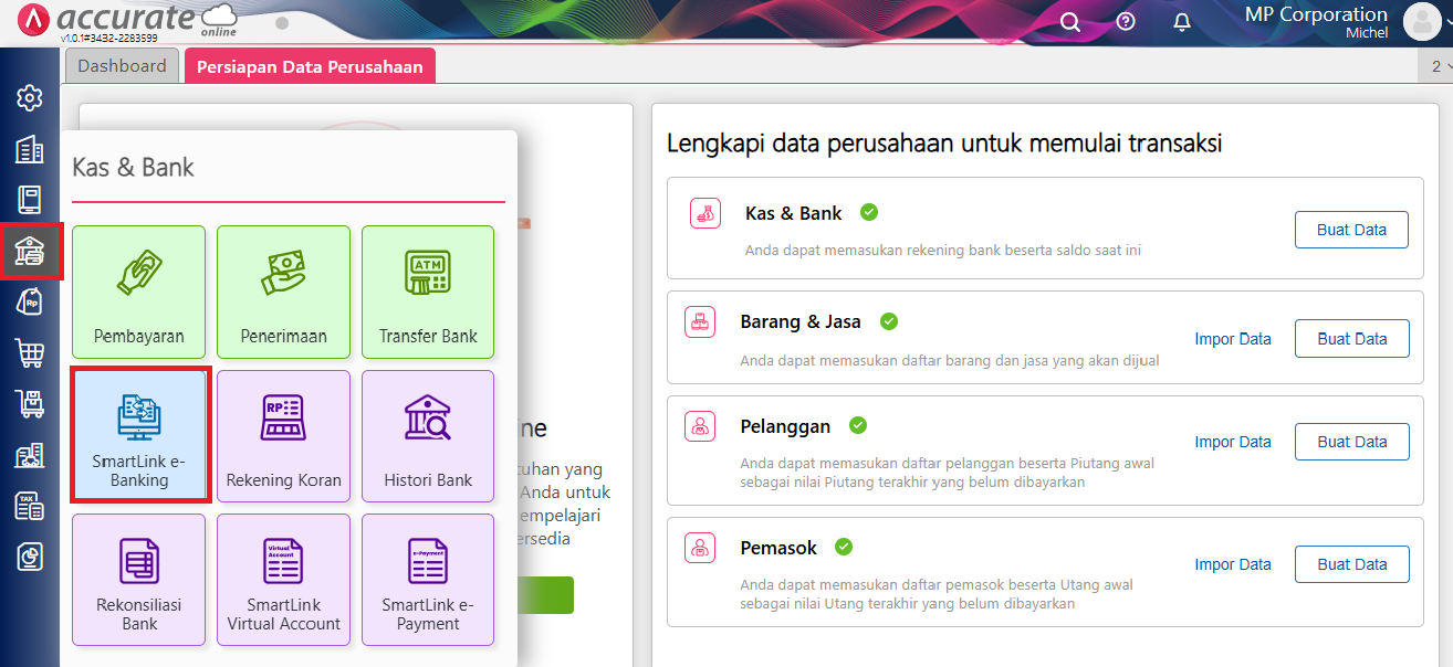 1. Masuk ke menu Kas & Bank, pilih SmartLink e-Banking